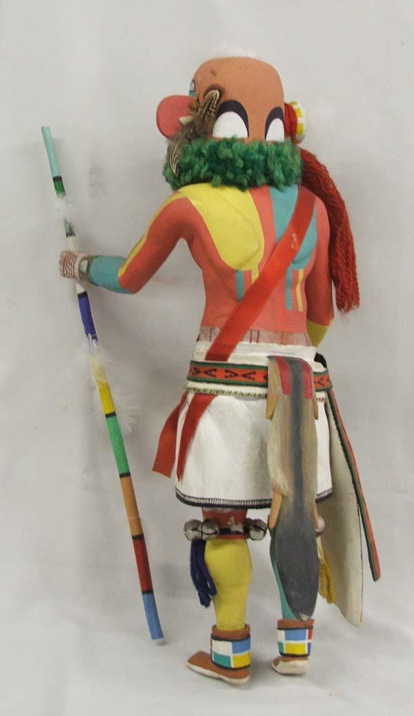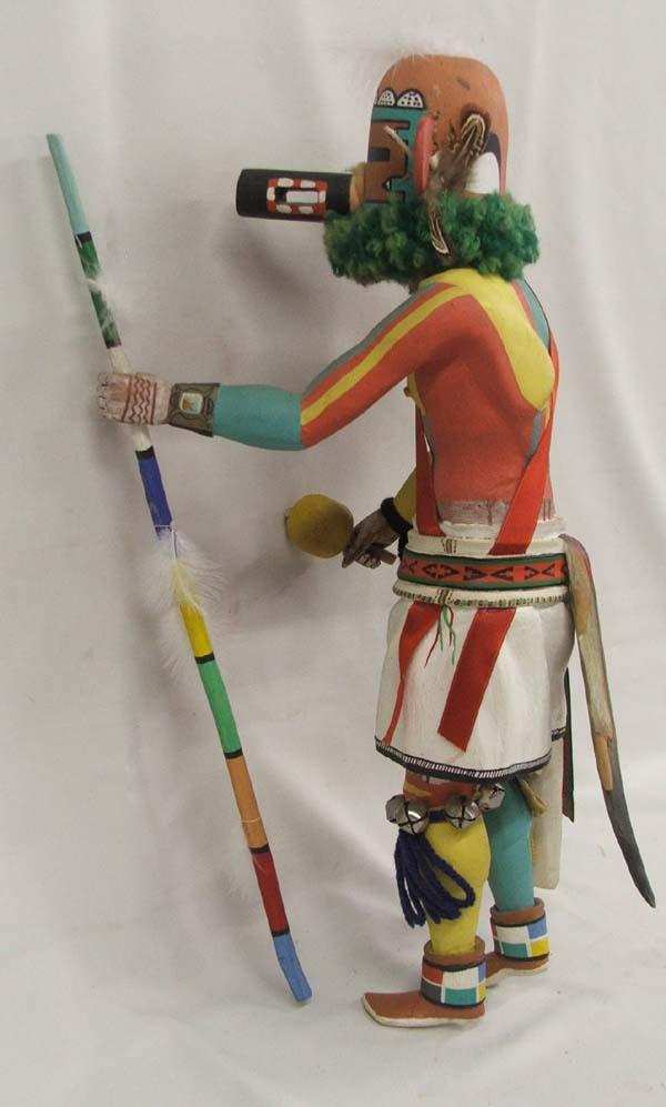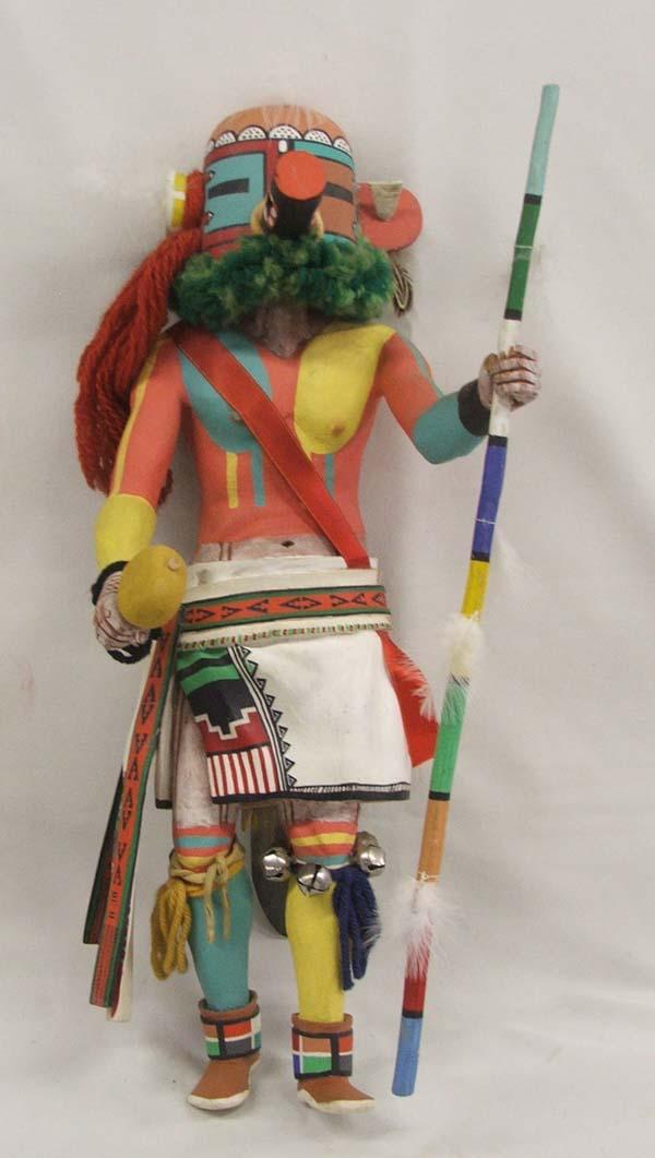Native American Hopi Kachina by H. Shelton, left hand has some damage, holding staff in left hand and rattle in right, measures 18.5''H x 7.5''W. Buyers Pay Actual Shipping and Handling Charges(see terms and conditions for more information).