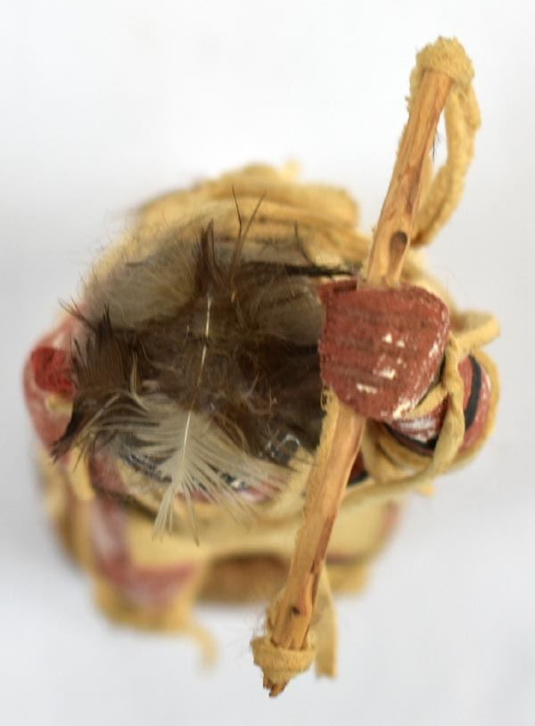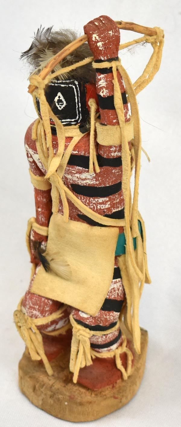 Native American Hopi Left Handed Kachina, measures 2'' x 7'' x 2'' and has artist's initials on the bottom, embellished with feathers and leather