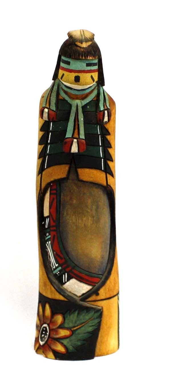 Native American Hopi Poli Butterfly Mana Kachina, measures 2.5'' x 8.75'', beautifully carved and hand painted in gorgeous vibrant colors, measures 2.5'' x 8.75'', it appears as though the wood feather tip on top is missing, however unsure