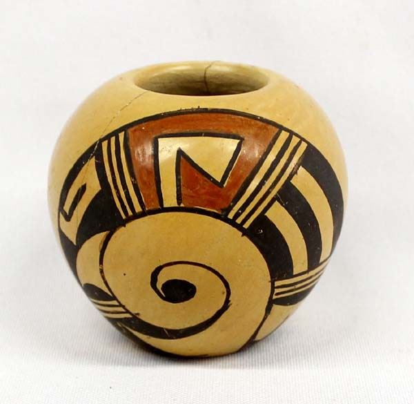 Native American Hopi Pottery Jar by V. Naha of Polacca, Arizona, measures 2.5'' x 2.5'' and is signed on the bottom, Sikyatki designs, nice thick walled jar, does have two pressure cracks