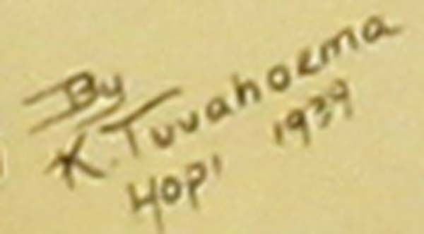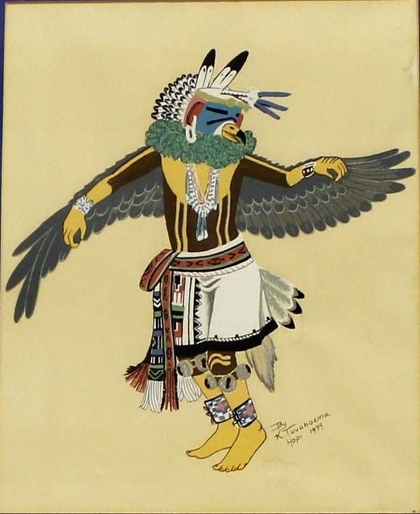 Native American Hopi Print ''Kachina Eagle Dancer'' by Kyrate Tuvahoema (1914-1942), visual measures 11.5'' x 9.5'', framed, matted, and under glass, some water staining in a couple of places, FYI: ''Tuvahoema's paintings were few; he contracted tuberculosis shortly after leaving school and spent much of his remaining life in sanatoriums in Arizona. He passed away in 1942 at the young age of 28. Most of his paintings were done in the late 1930s.''