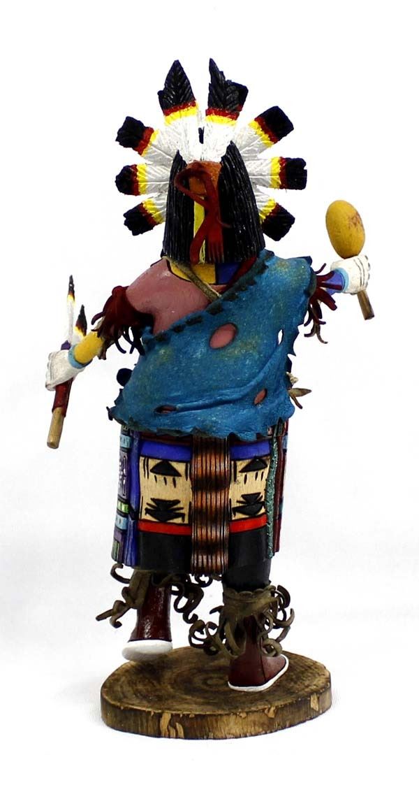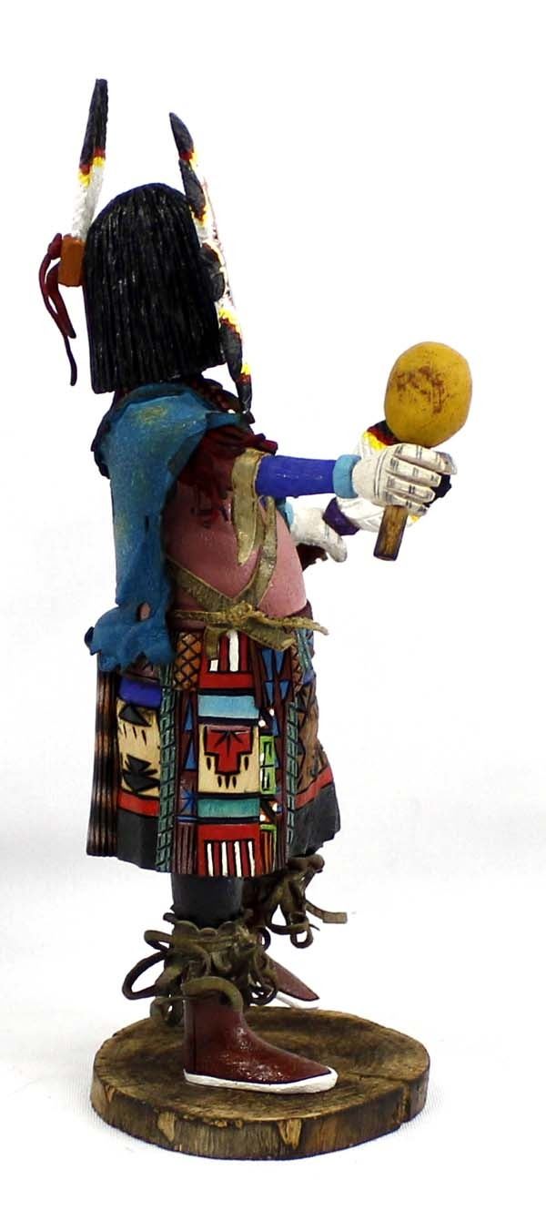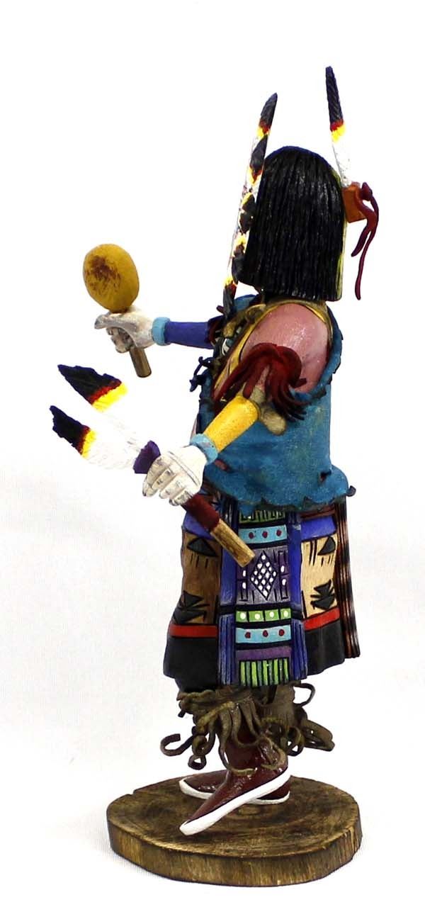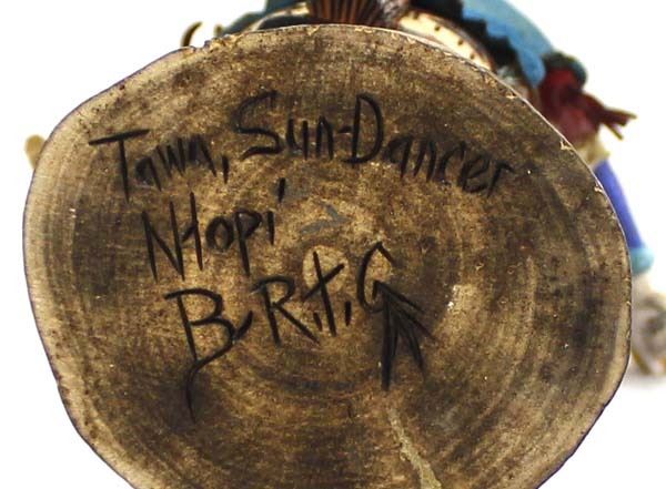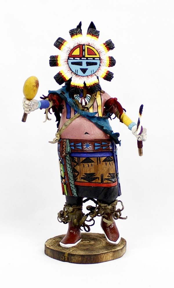 Phenomenal Native American Hopi Tewa Sun Dancer Kachina, artist's initials on the bottom, measures 5'' x 9'', beautifully hand carved and painted, embellished with leather