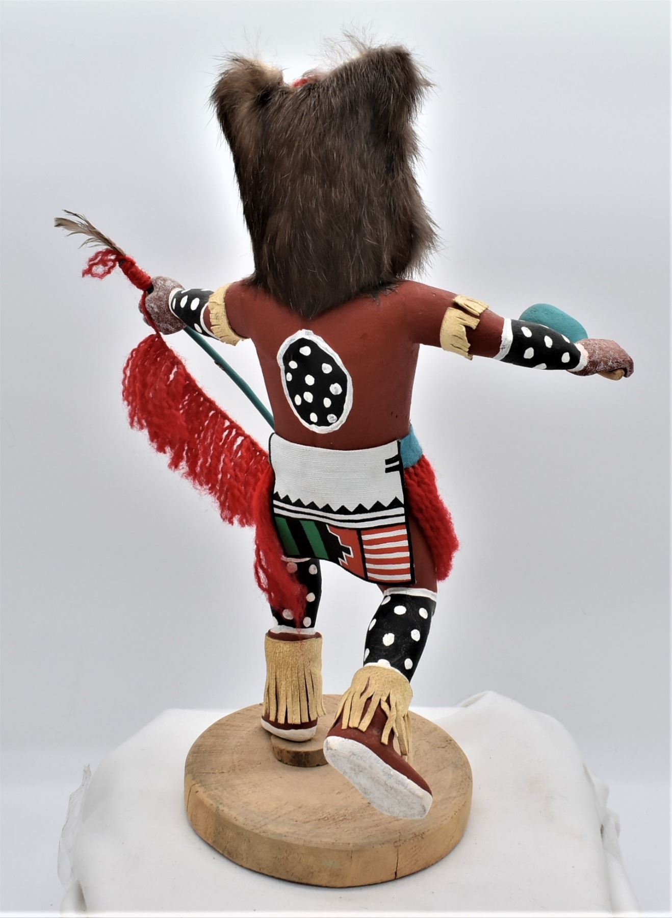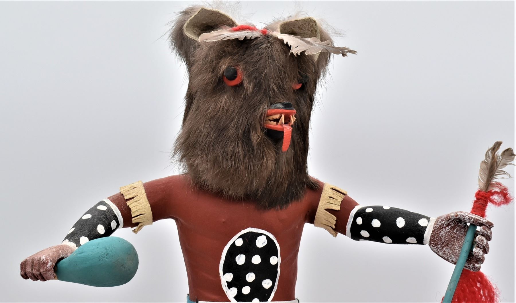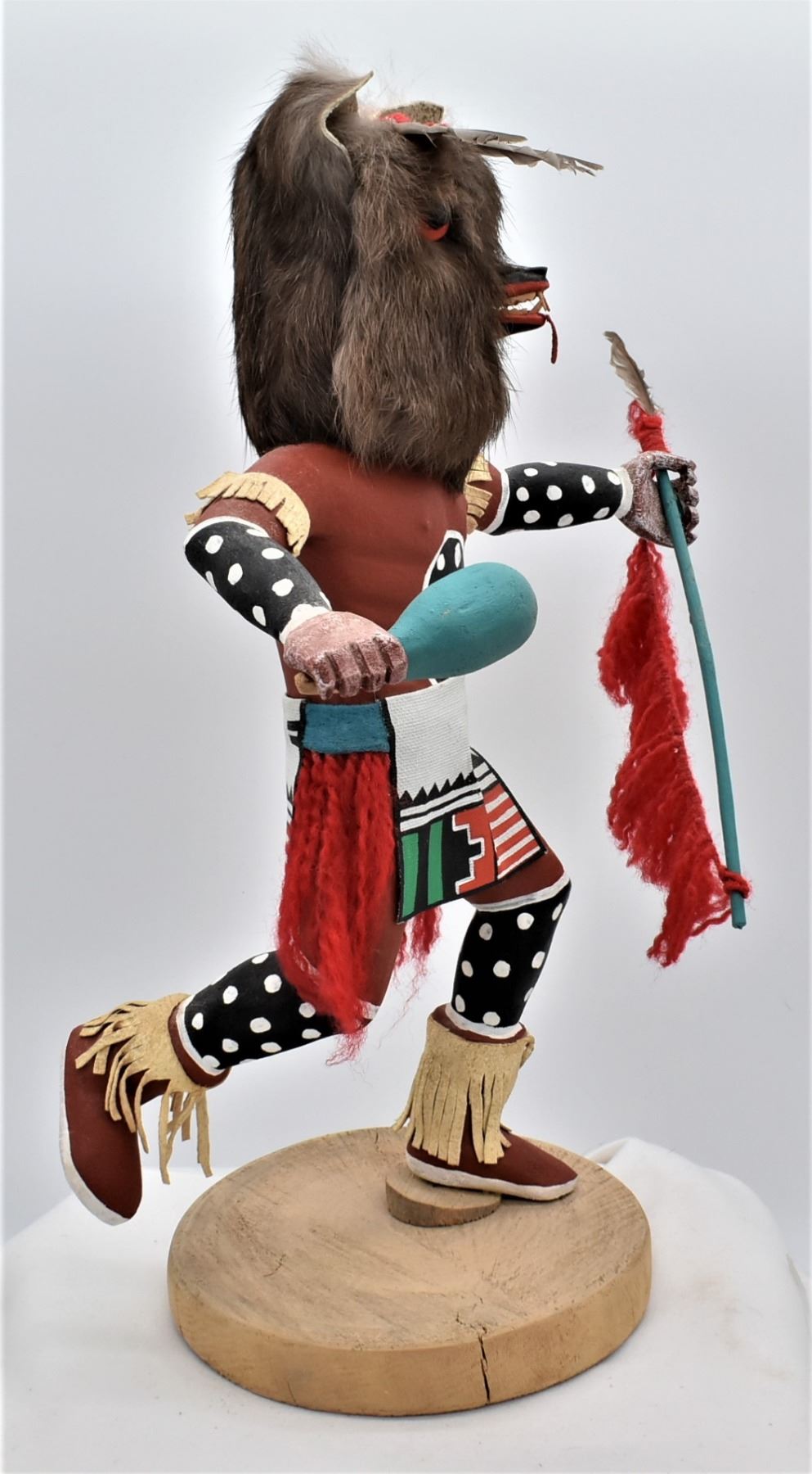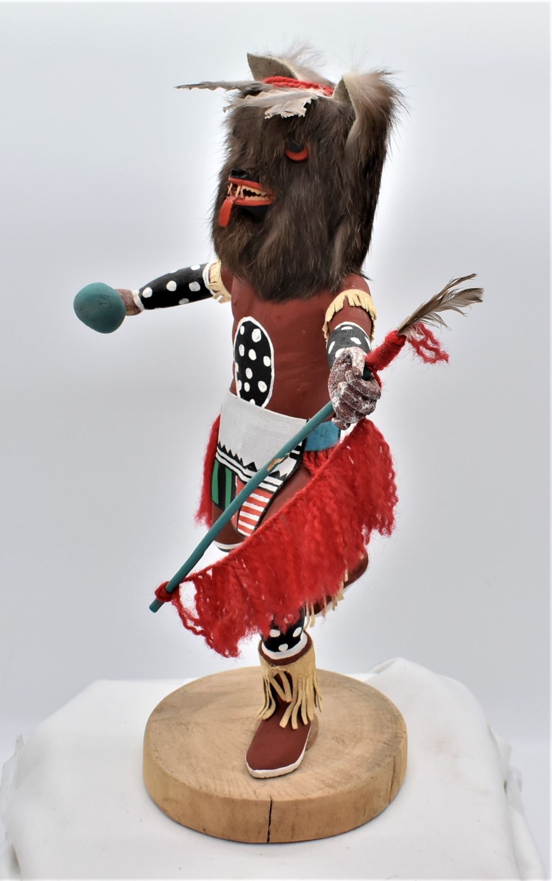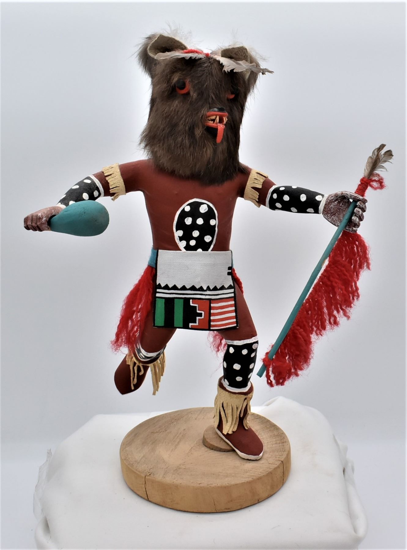 Vintage Native American Hopi Wolf Kachina, measures 11'' x 15'', embellished with fur, yarn, feathers, leather, and hand painted canvas-like cloth, well executed