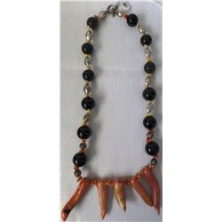 This Treasure Necklace has silver, glass beads and coral. The coral pieces measure 1.5 to 2.5" inches long. This an interesting conversation ...