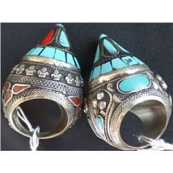 These are very unusual rings from Tibet. They are 3 x 2 inches and have turquoise, lapiz and silver. Condition: Good. Shipping $14.50