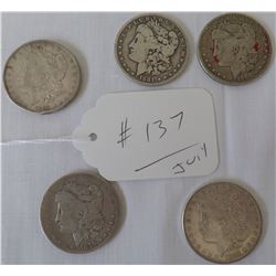 137 - Five Morgan Silver DollarsHelm Auction, Inc.