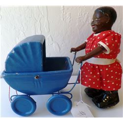 Vintage Pull toy Marked 499 Kitty with bell- made from wood, paint, string and metal tacks and rods, printed paper. Still works. Made in East Auror