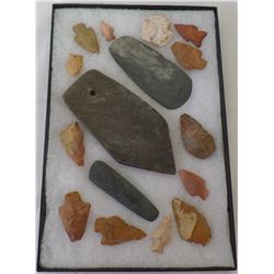 The War club head measures 3 x 3 x 2 inches and the celt measures 4 1/2 x 2 x 19 inches. Both items have nicks and are considered to be field finds.