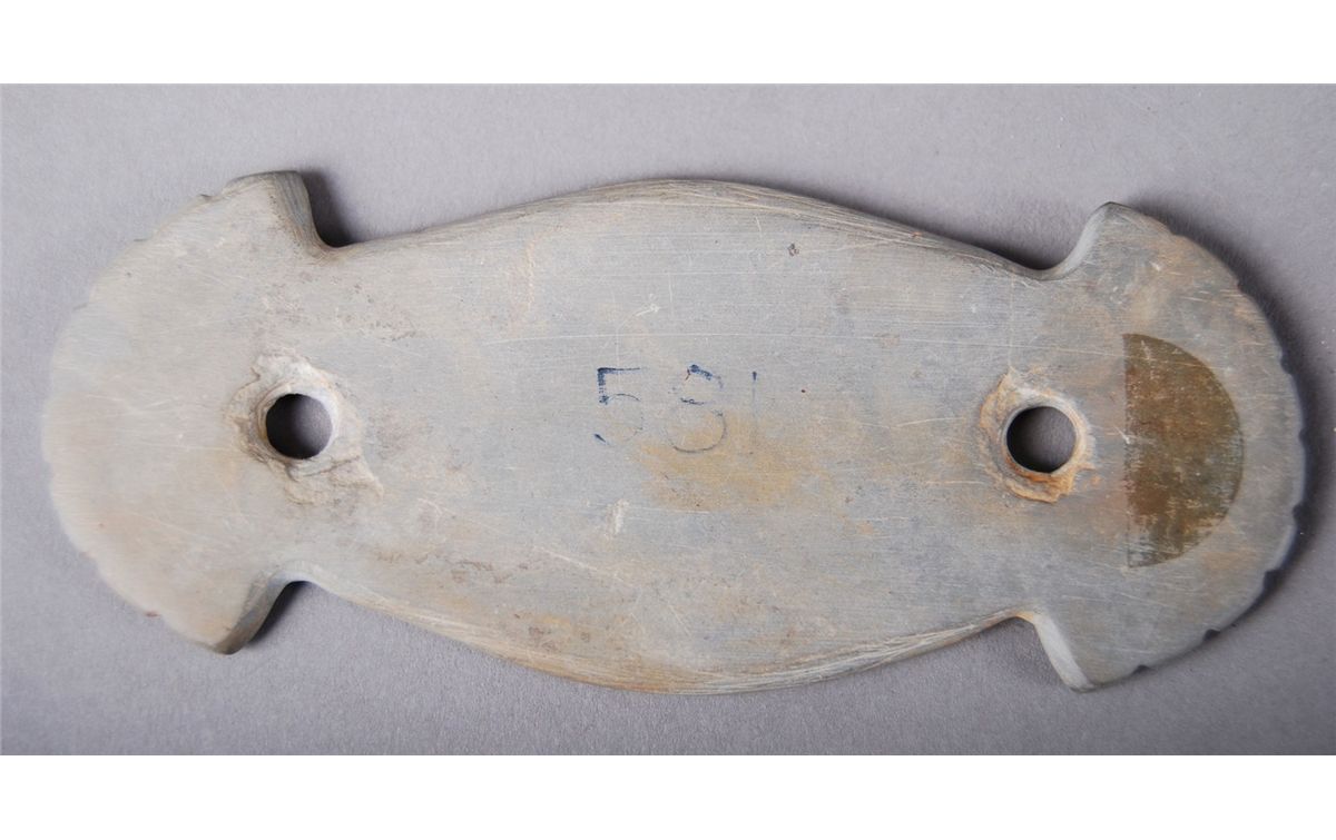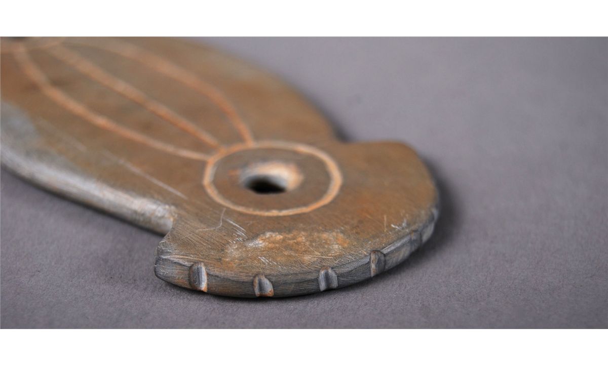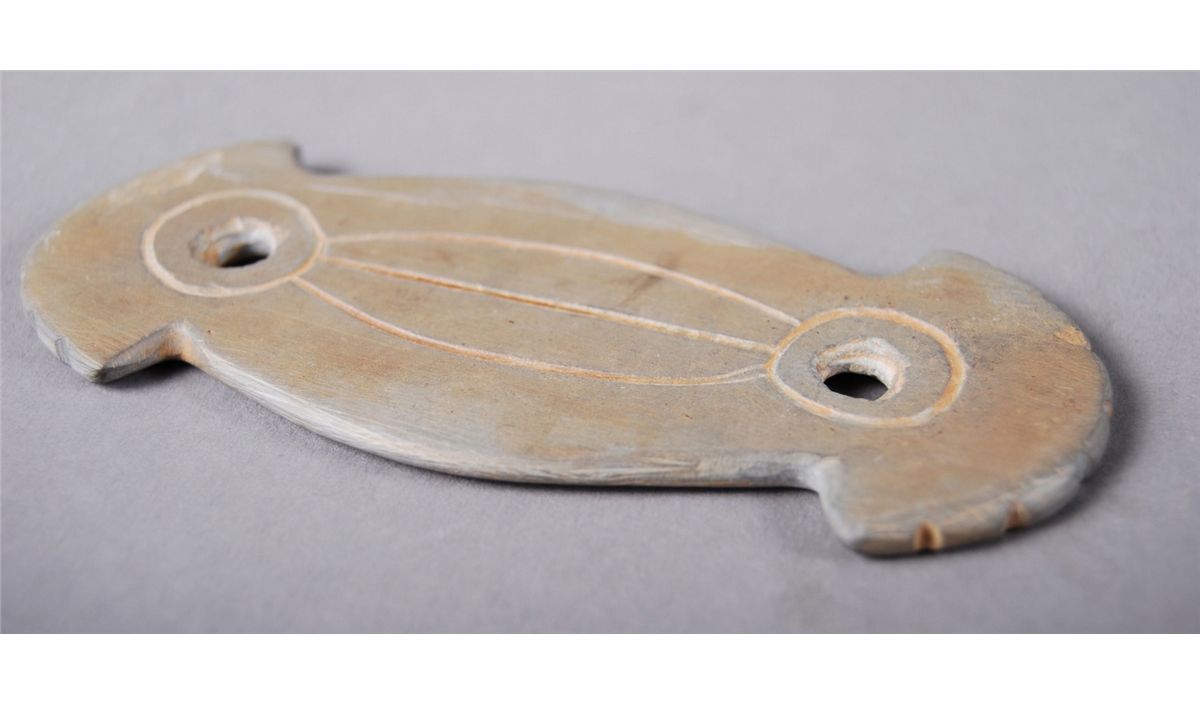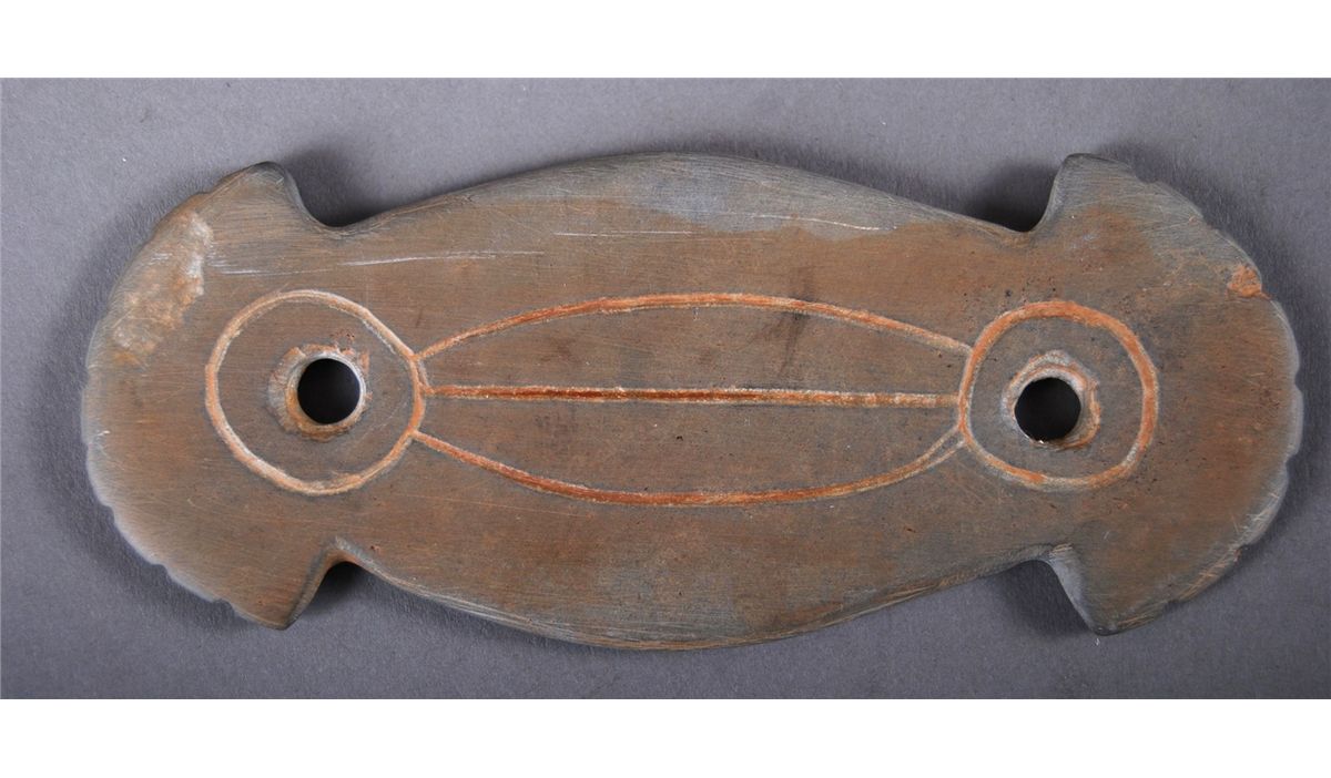 Native American Indian Artifact, Banner Stone, carved design, Old Florida Found. [Height/Length (in)= 4, Width (in)=1.75, Depth (in)=0.125, Weight (lbs)=0.25] With C.O.A. signed by Chief Joe Dan Osceola & Seminole Tribe. Go to: www.pangaea-auctions.com for more information about this collection.