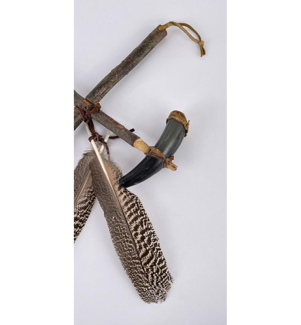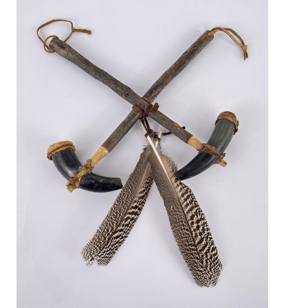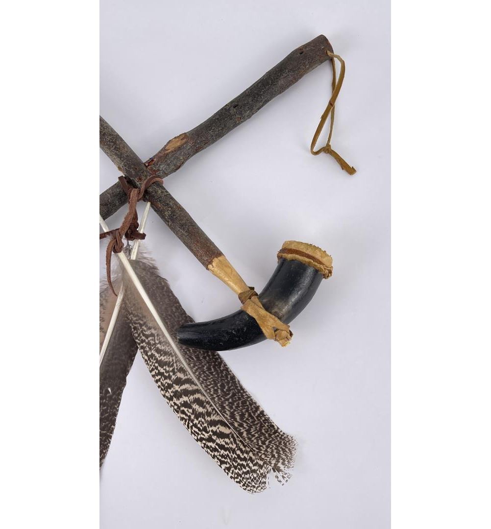 Measures 16" wide and 16" to bottom of horn. Rattles are fixed together. Feathers are dyed turkey.