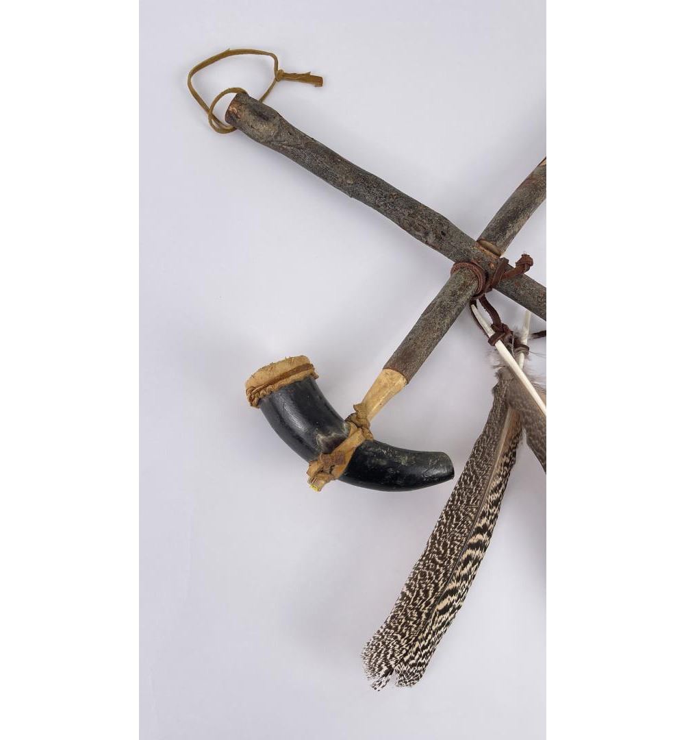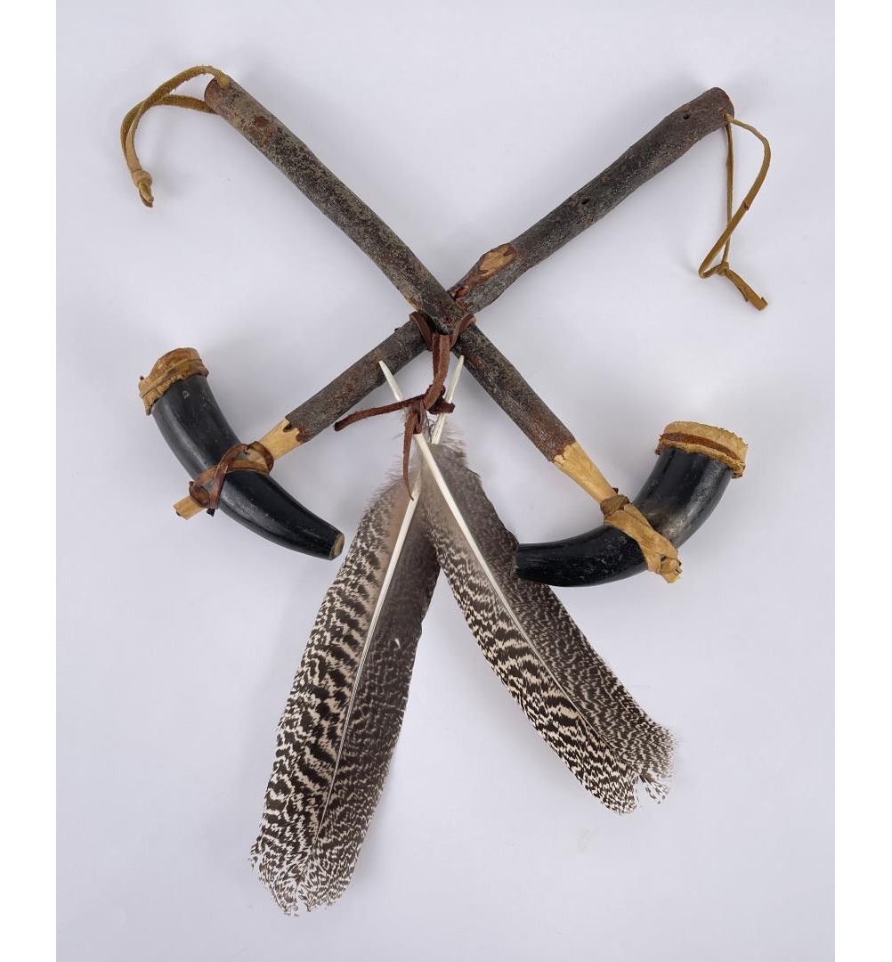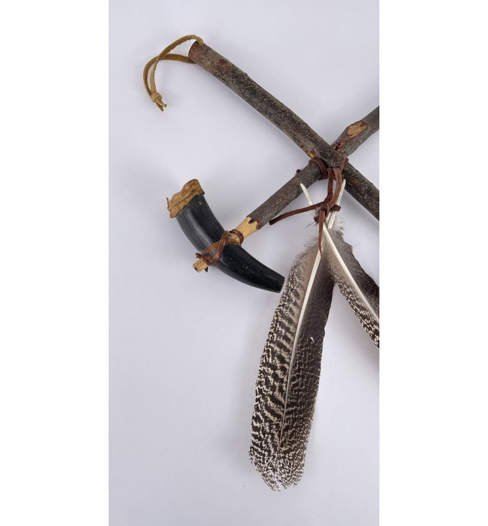 Measures 16" wide and 16" to bottom of horn. Rattles are fixed together. Feathers are dyed turkey.
