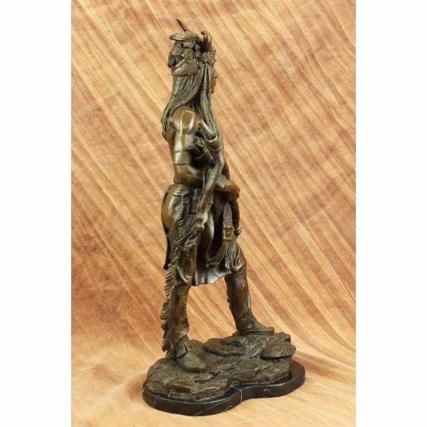 The Native American Indian Chief Stands Under A Furrowed Brow With Grave Eyes. In A Silent Prayer, He Asks The Great Spirit To Protect And Give Victory To Their Tribe Against Their Adversaries. He Sports The Typical Regalia Of Buckskin, Tasseled Leggings With Moccasins. He Carries In His Arms Both A Hatchet And A Shield In Defense Of Peace For His Tribe. He Was Captured Using The Ancient Method Of Lost-Wax Casting And Stained With A Brown Patina Finish. The Chief Is Mounted Upon A Black Marble Base. Bronze Dimensions With Marble Base: Height 20 X Width 10 inches. Weight: 20 Lbs.