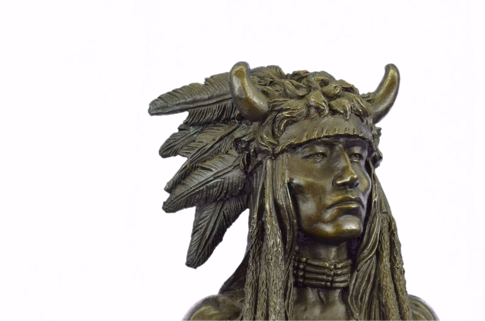 The Native American Indian Chief Stands Under A Furrowed Brow With Grave Eyes. In A Silent Prayer, He Asks The Great Spirit To Protect And Give Victory To Their Tribe Against Their Adversaries. He Sports The Typical Regalia Of Buckskin, Tasseled Leggings With Moccasins. He Carries In His Arms Both A Hatchet And A Shield In Defense Of Peace For His Tribe. He Was Captured Using The Ancient Method Of Lost-Wax Casting And Stained With A Brown Patina Finish. The Chief Is Mounted Upon A Black Marble Base. Bronze Dimensions With Marble Base: Height 20 X Width 10 inches. Weight: 20 Lbs.Please Note: This is a reproduction bronze sculpture from the original molded and signed. This featured bronze sculpture is a recast after the original, and has been done recently. This 100% bronze sculpture is an abstract piece certain to be a conversation piece.Please Note: This is a reproduction bronze sculpture from the original molded and signed. This featured bronze sculpture is a recast after the original, and has been done recently. This 100% bronze sculpture is an abstract piece certain to be a conversation piece.