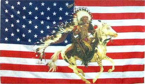 US Flag background with a Native American Indian Warrior on horseback. 3' X 5' with reinforced