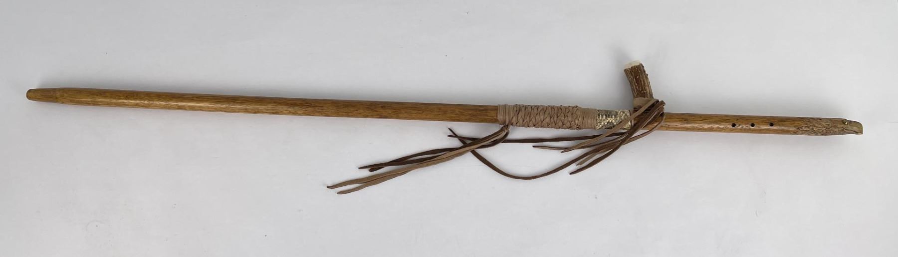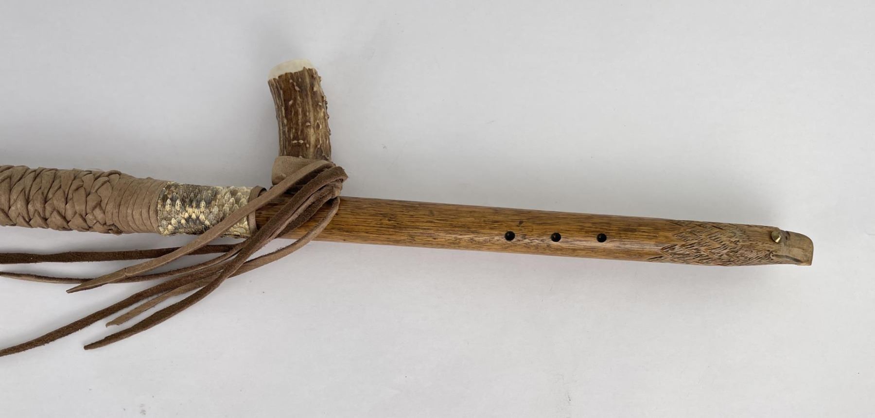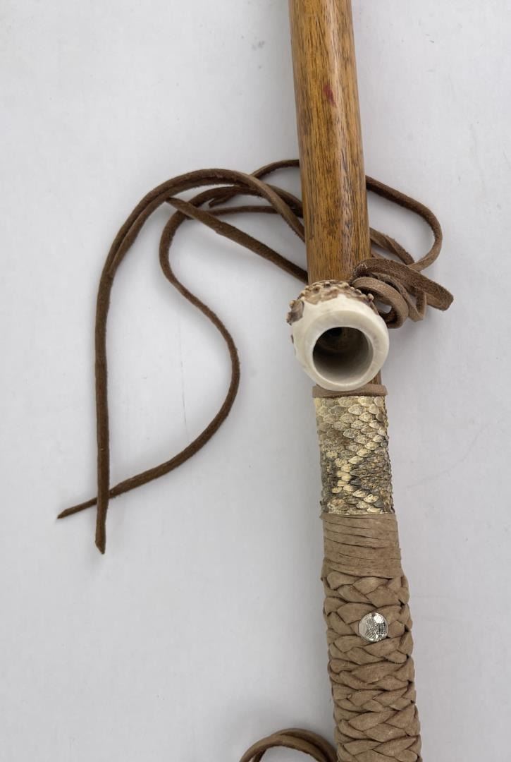 Very nice pipe. Eagle effigy end. Horn pipe bowl. Leather and snakeskin wrapped. 44.75" long overall.