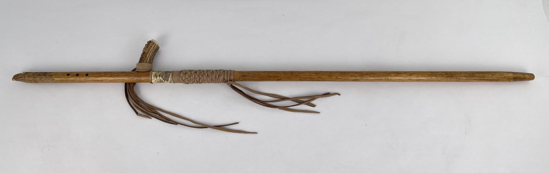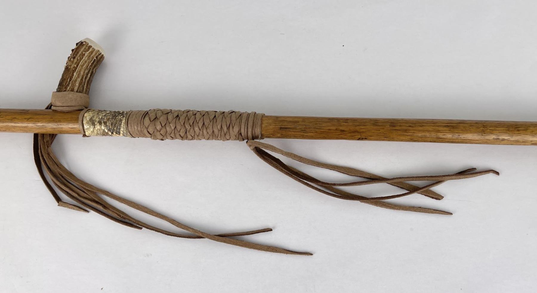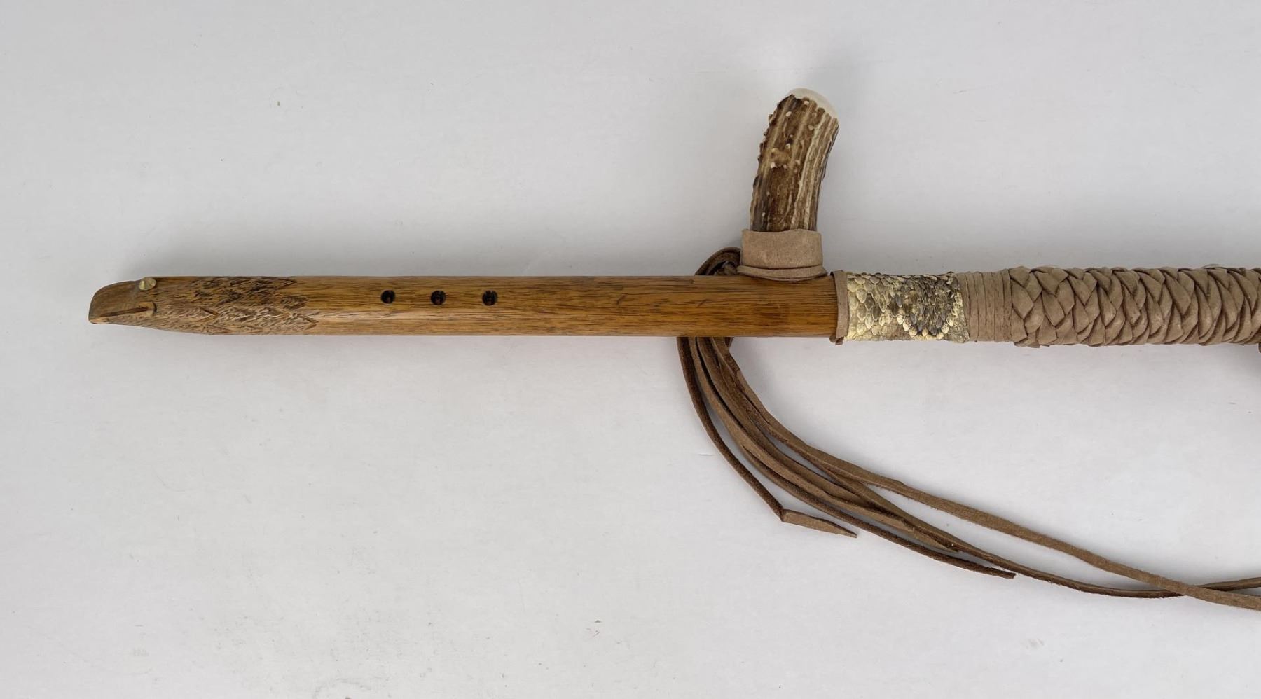 Very nice pipe. Eagle effigy end. Horn pipe bowl. Leather and snakeskin wrapped. 44.75" long overall.
