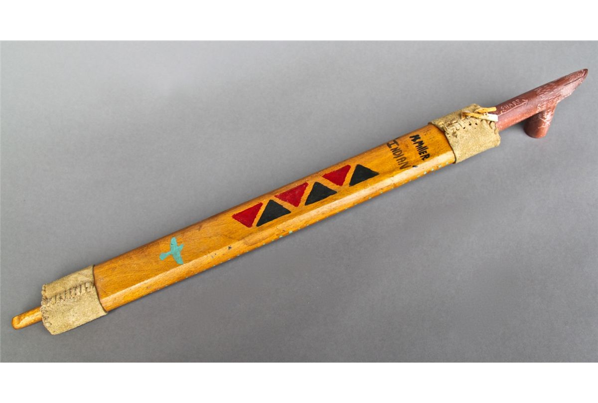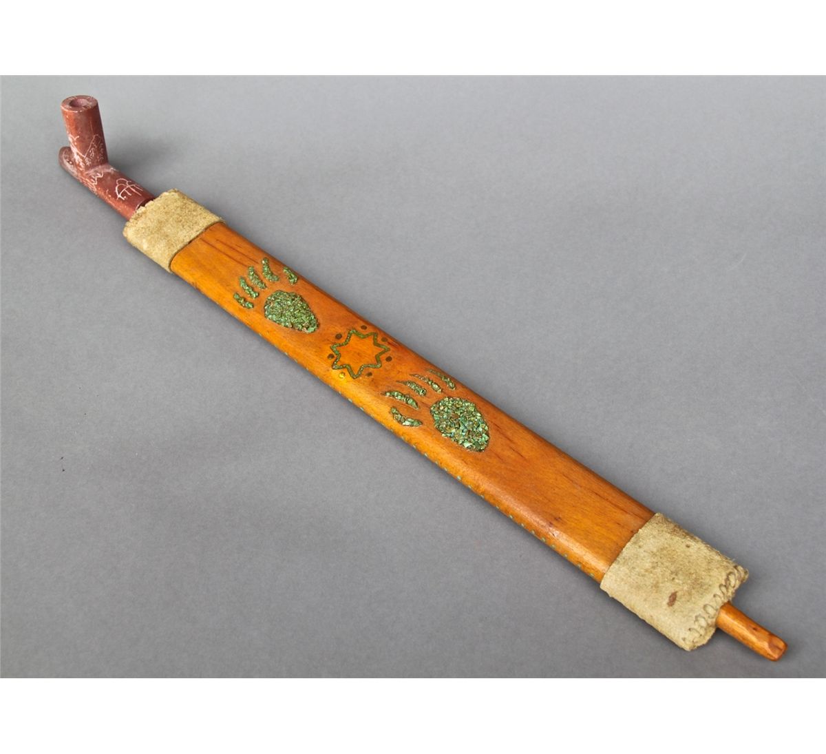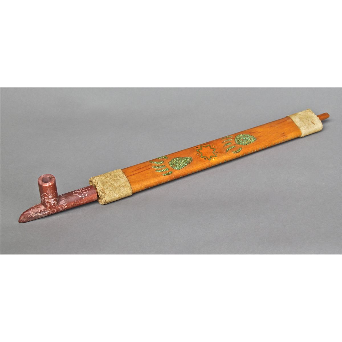 Native American Indian Peace Pipe with Minnesota Pipestone, leather and Turquoise chip inlay. [Height/Length (in)= 23, Width (in)=2, Depth (in)=1, Weight (lbs)=1] With C.O.A. signed by Chief Joe Dan Osceola & Seminole Tribe. Go to: www.pangaea-auctions.com for more information about this collection.