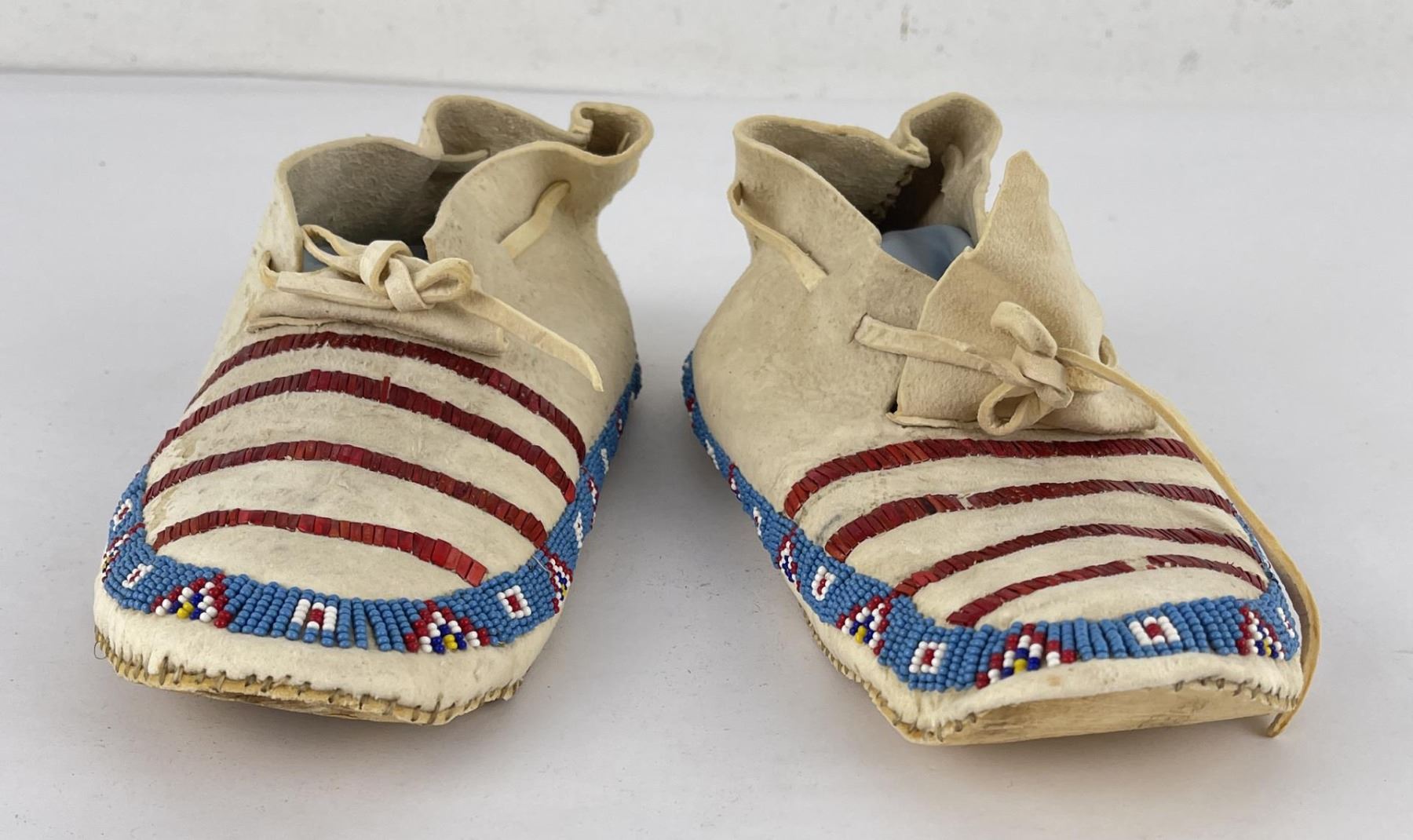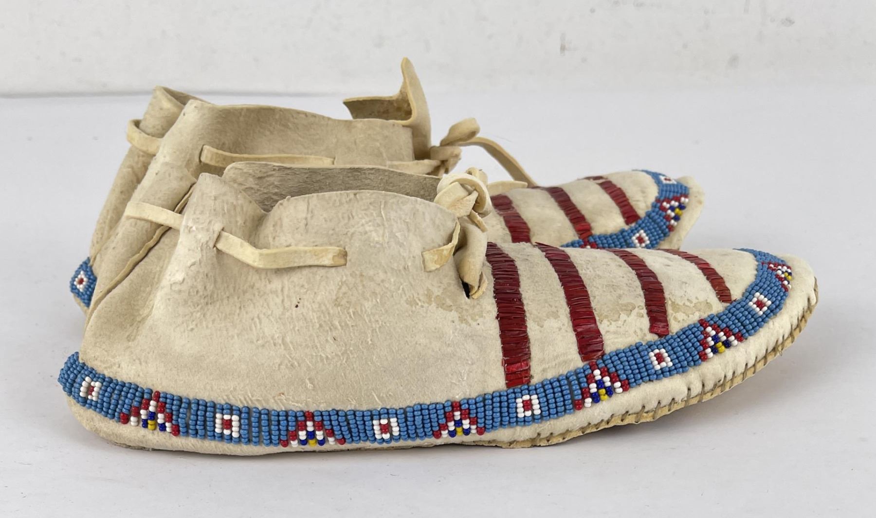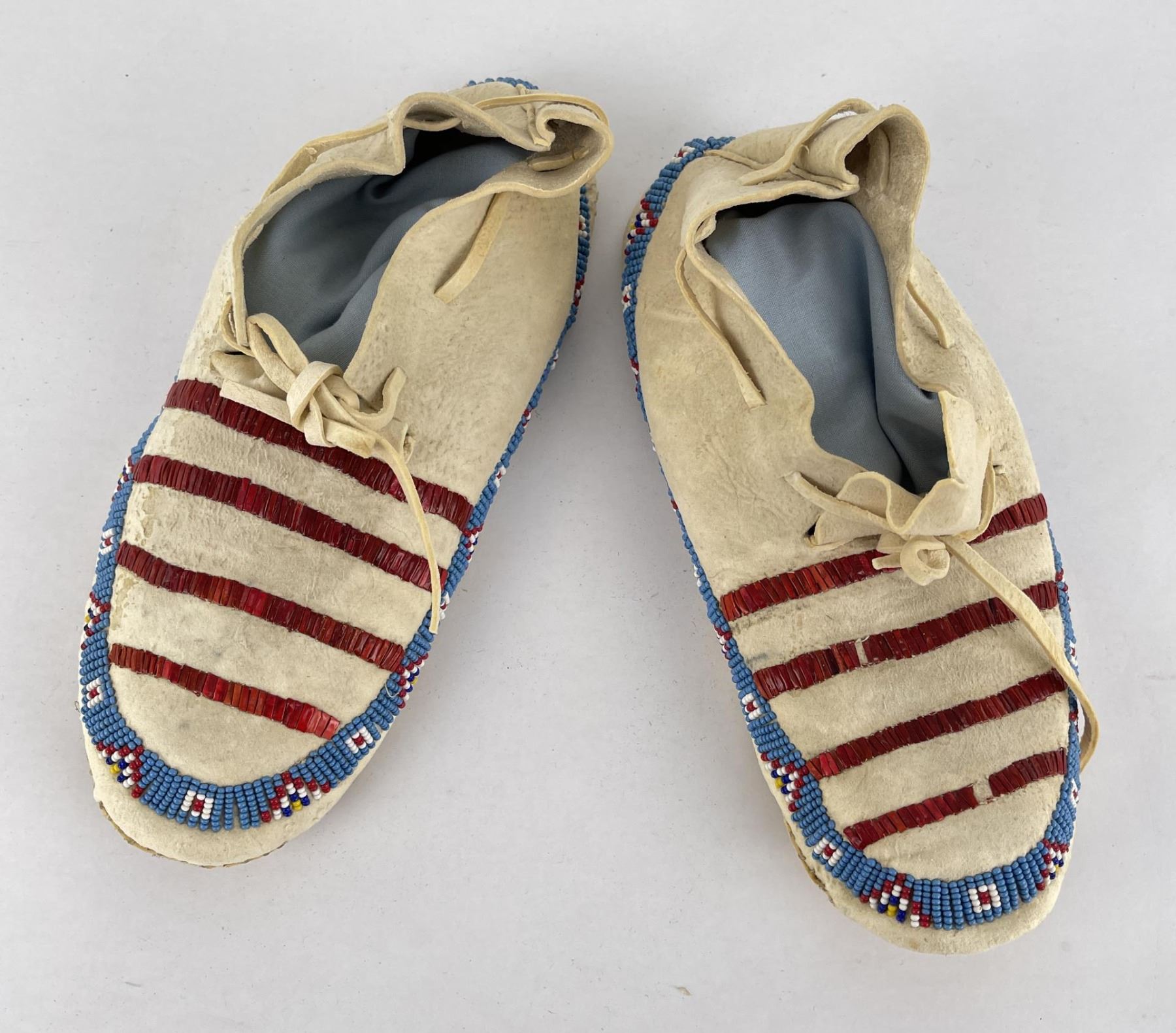 Nice pair of moccasins. Second half of the 20th Century. 9.5" long. Made by Mrs. Shields.