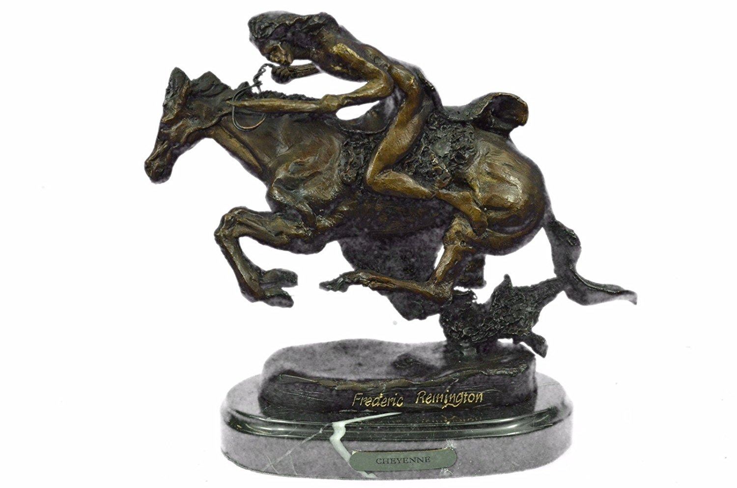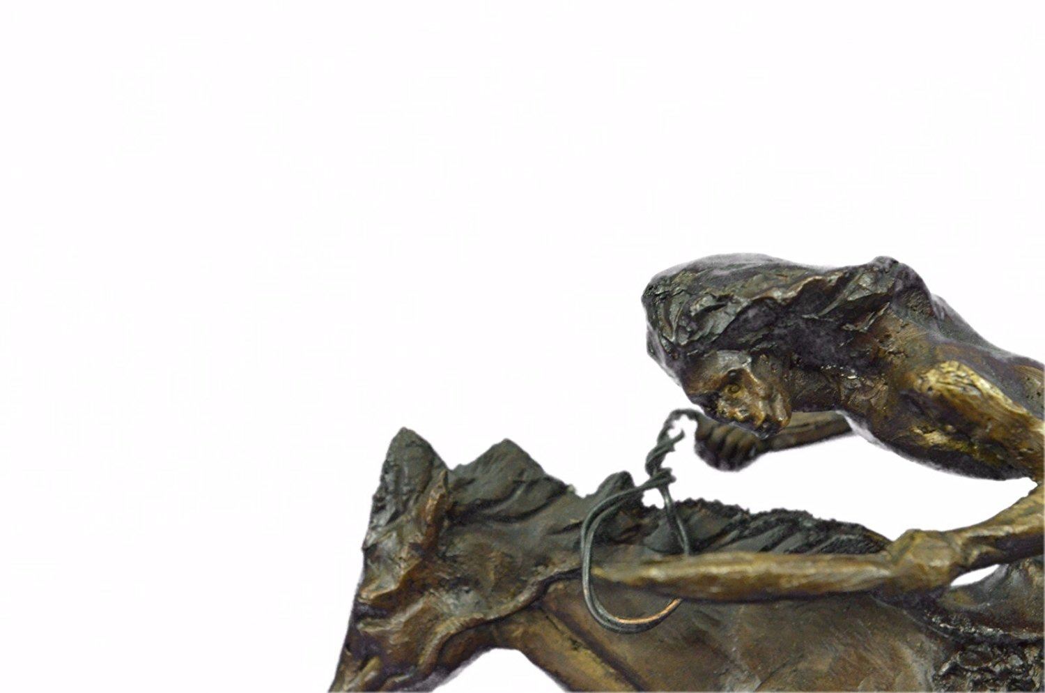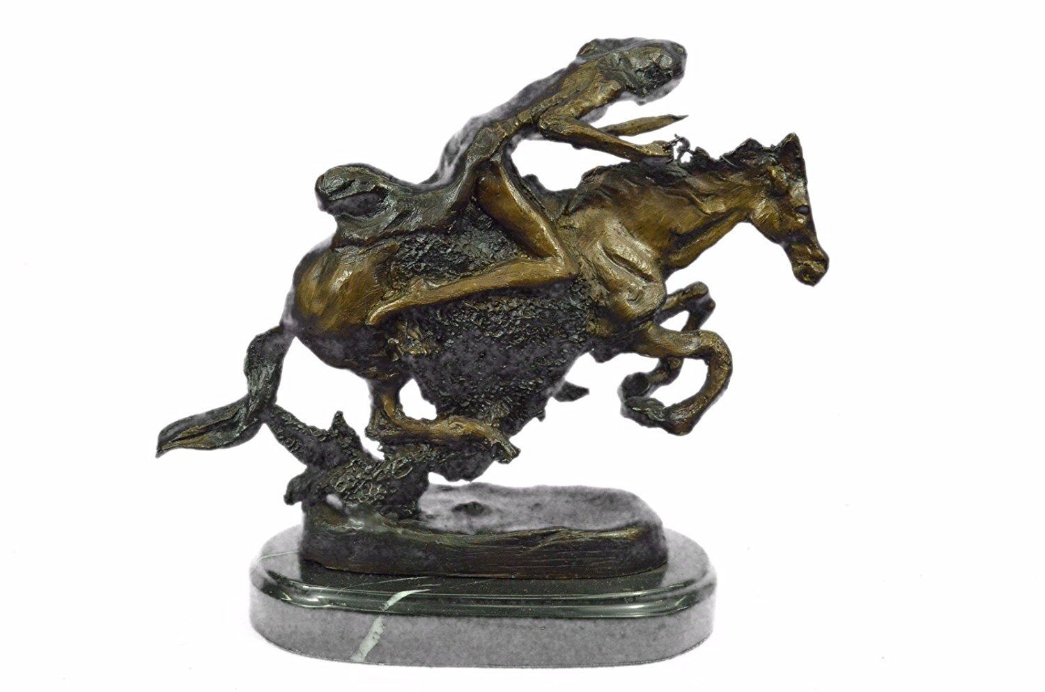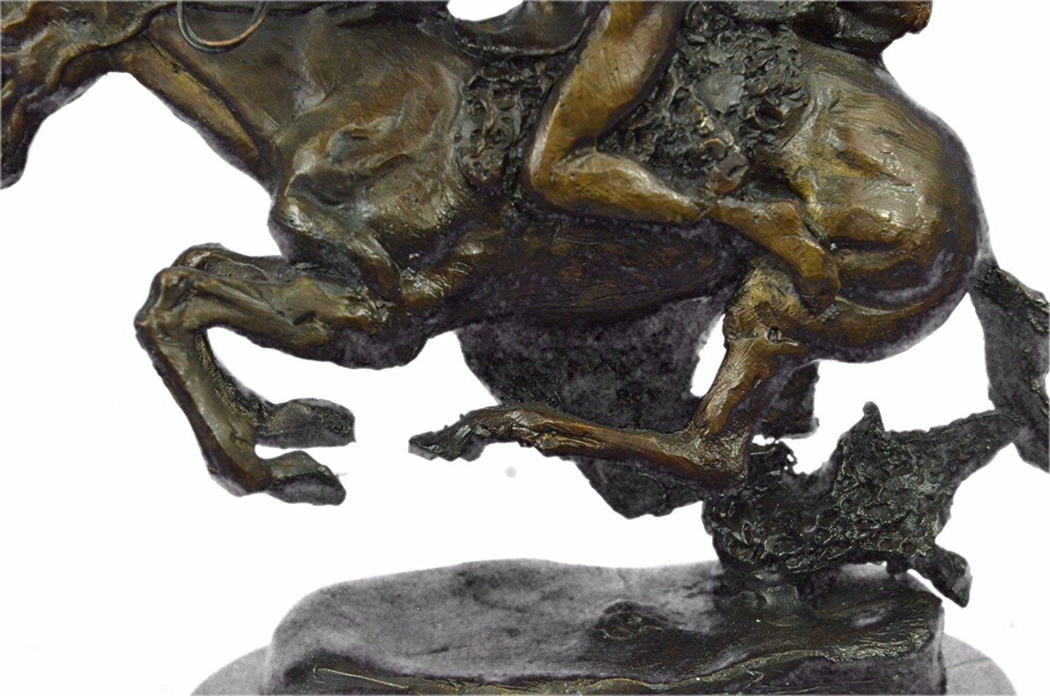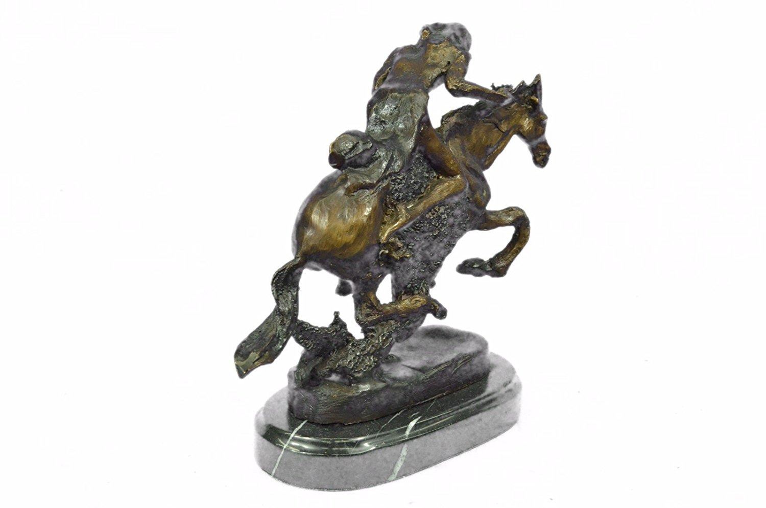 A native American Indian gallops across the desert with his horse. Armed with a spear, he leans into his horse's body, ready to attack. The horse keeps his head low, its nose pointed forward as he runs powerfully. The careful details can be seen in the cut of the horse's strong legs and the glare in its face. 100% bronze and handmade, this brown patina sculpture was cast using the Lost Wax Method and mounted on a black marble base. Bronze Dimensions with Marble Base: Height 8 X Width 10 inches. Weight: 7 LBS. Inventory: 19-630854591