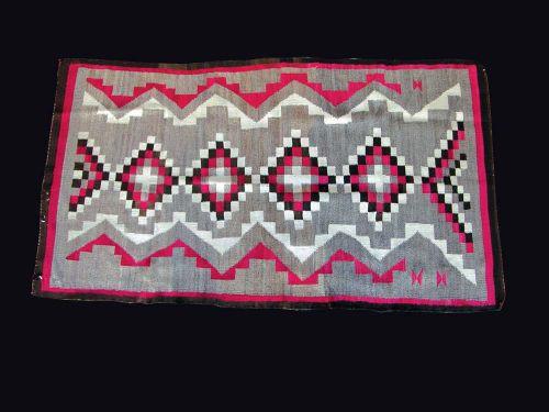 Native American Indian Rug, black, red and brown. Some fraying on edges otherwise very good condition. 66 X 36 inches.