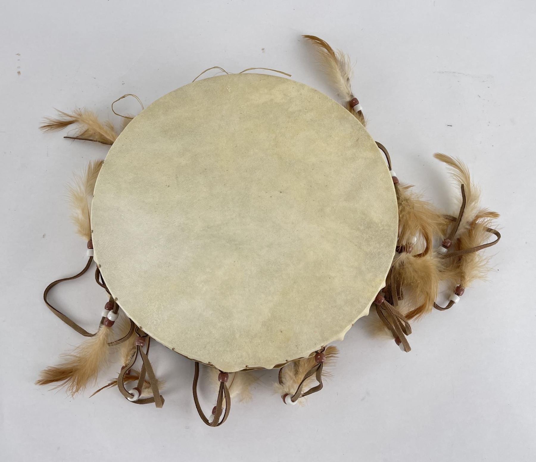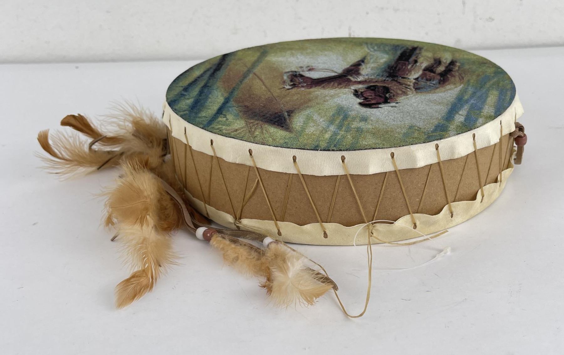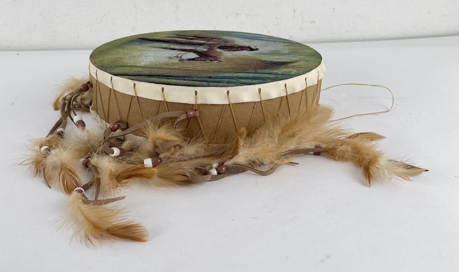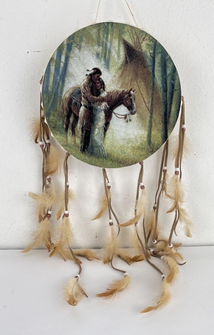 Has feather drops. Printed scene. 9 1/4" diameter.