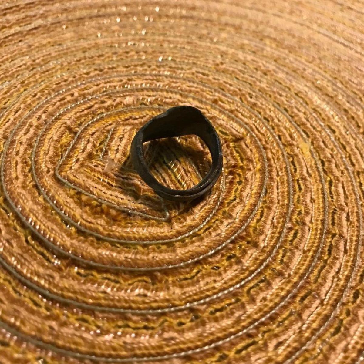 1700's - 1800's Native American Indian trade ring, sheet copper with overlapping terminal, the band expanded toward the rounded bezel, with geometric patterns, possibly pictographs. Approx size 3.