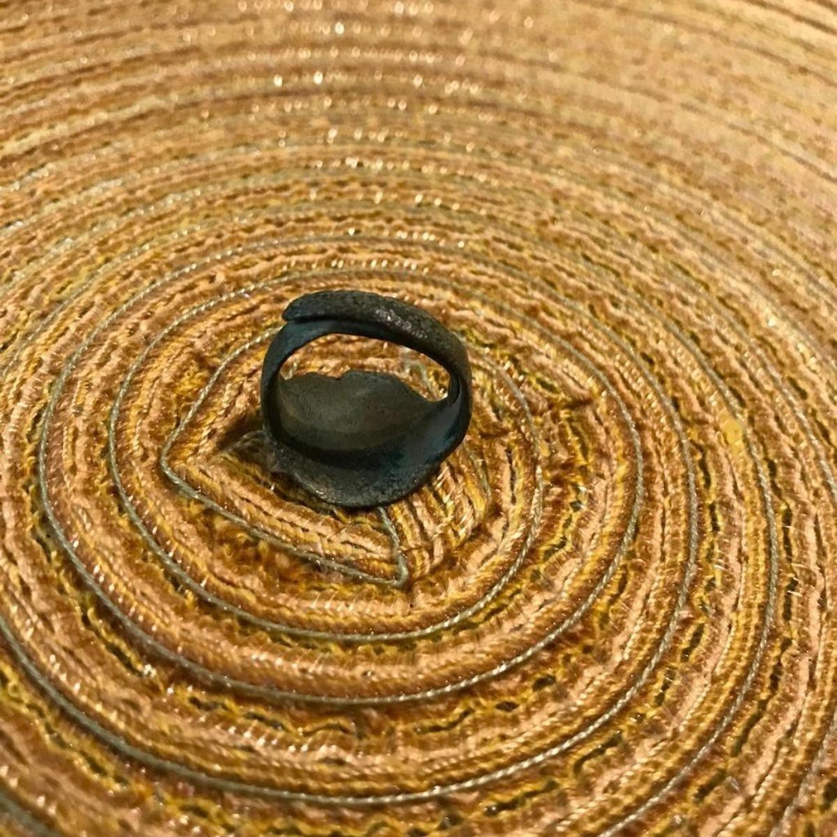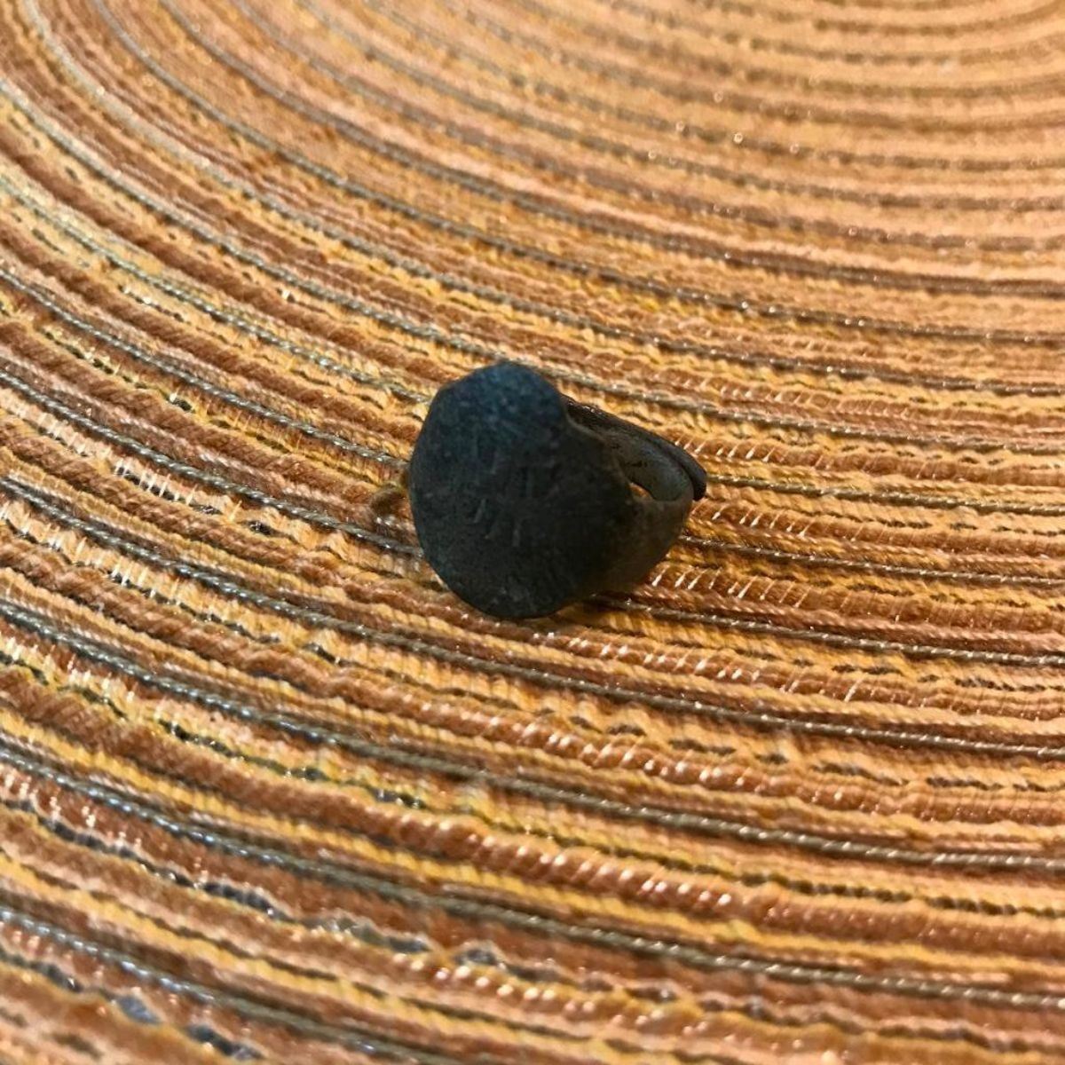 1700's - 1800's Native American Indian trade ring, sheet copper with overlapping terminal, the band expanded toward the rounded bezel, with geometric patterns, possibly pictographs. Approx size 3.