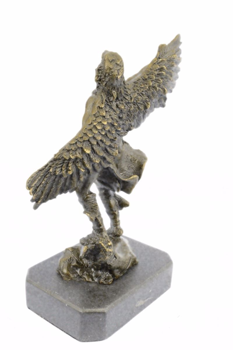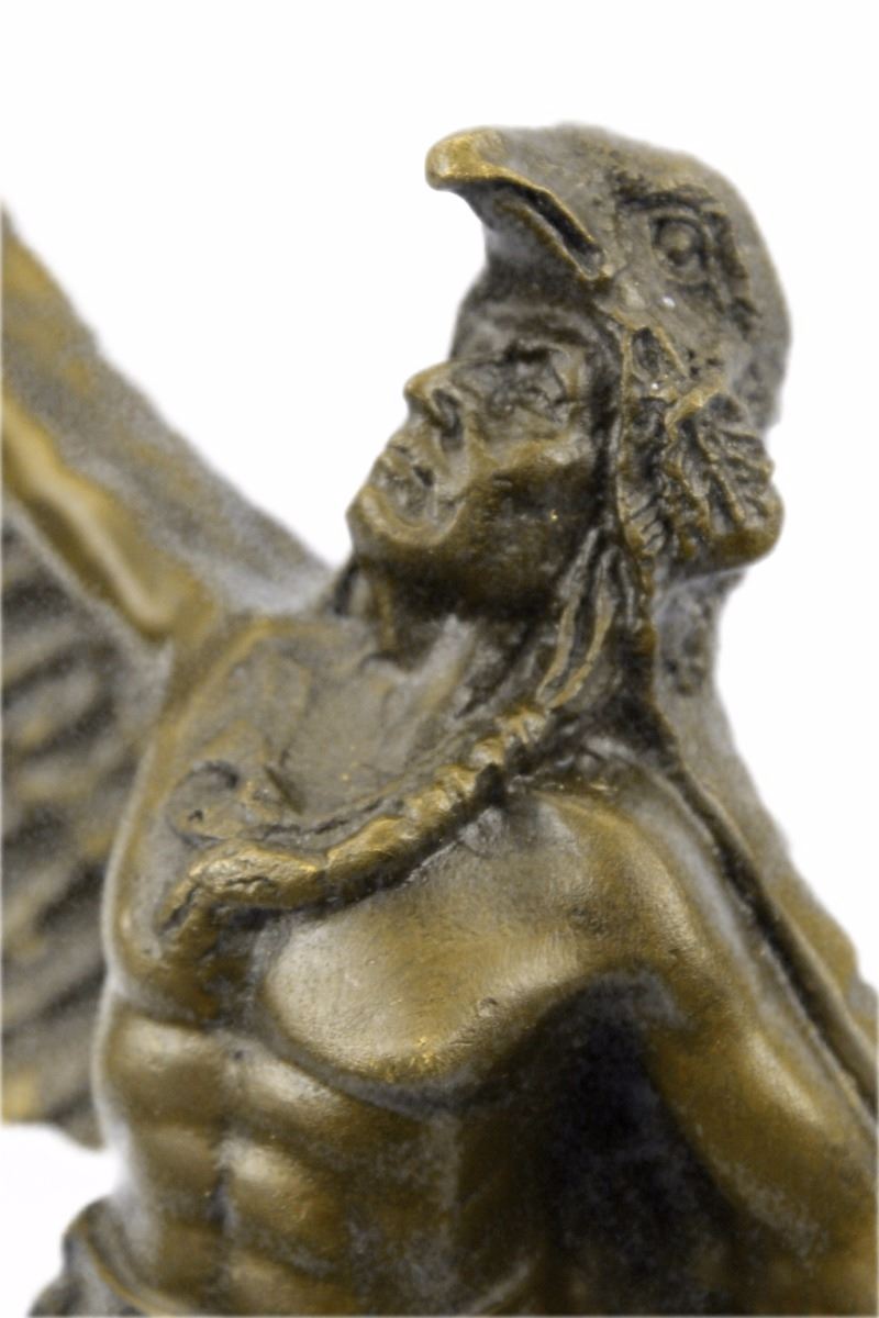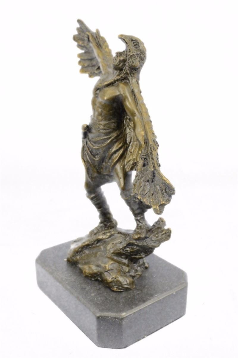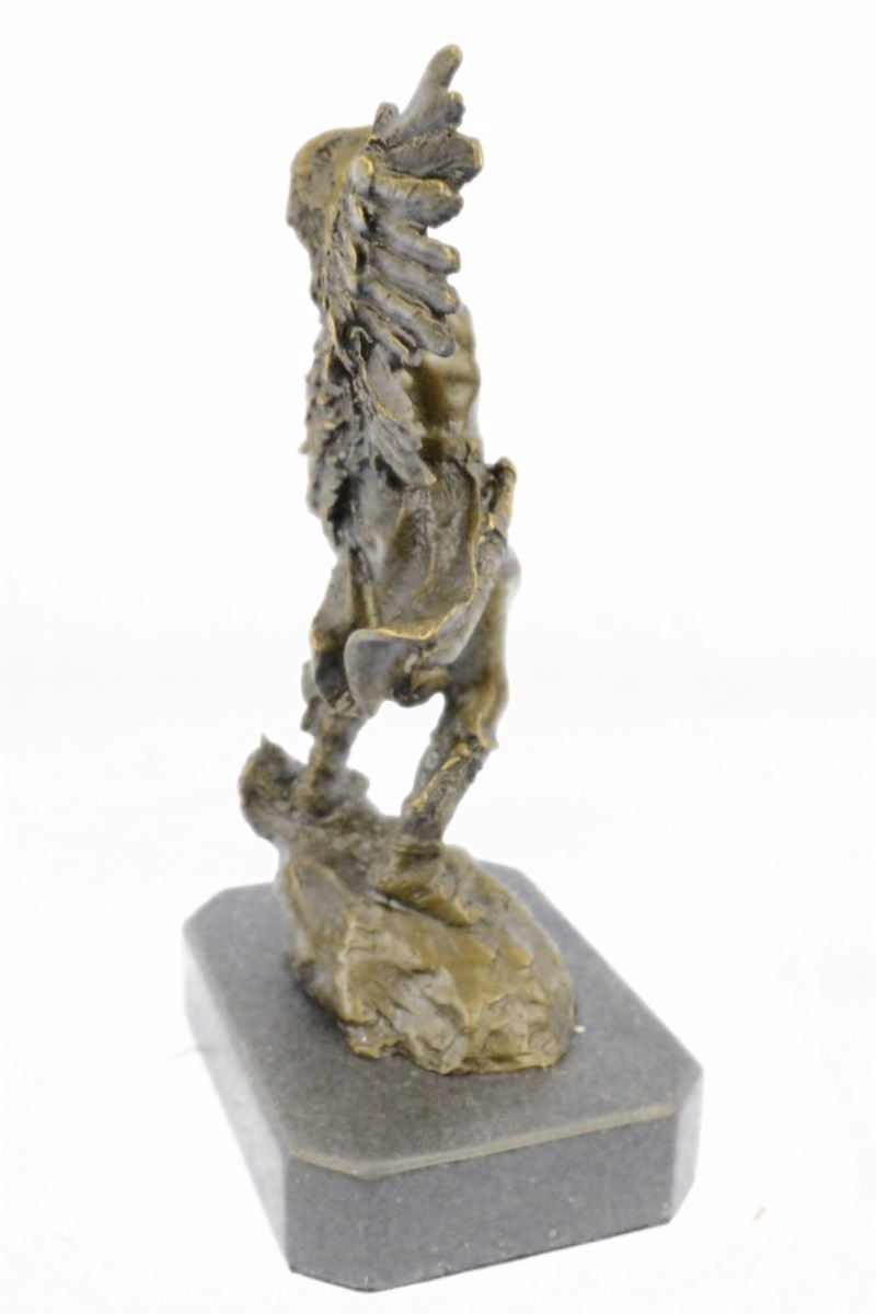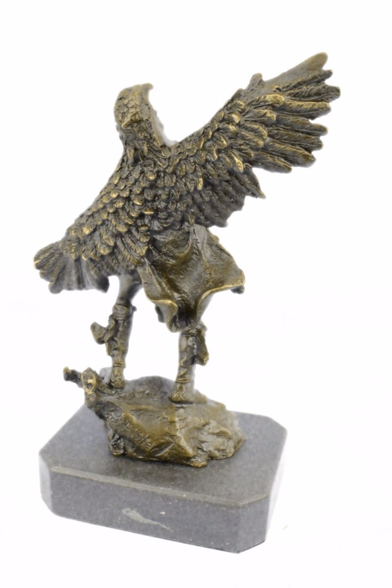 Eagle Dancer Celebrate The Native American Culture With A Native American Statue Inspired By Indian Tribes Of The Past With This Piece That Depicts A Native American Man Wearing Eagle Fur On His Back. He Raises His Hands Out To His Sides, Mimicking The Soaring Of An Eagle And He Looks Up To The Sky In Reverence Of The Majestic Creature. The Detail Of This Skilled Artisan Shows A Wide Array Of Native American Dress As This Man Wears A Belted Loin Cloth, Legging Boots, A Large Hunting Knife, And The Top Of The Eagle Covers The Man's Head Just Enough To Observe The Twisting Of His Braided Hair. This Kind Of Detail Is Not Easy To Master. This Piece Was Undoubtedly Produced By A Highly Skilled Artisan. The Stern Lines In The Man's Face Let You Know That He Has Not Only Been Through A Lot In His Lifetime, But That He Is Also Very Serious About His Mission. Eagle Dances, Ceremonies And Societies Occur Throughout North American Indian Legends And Culture. Golden Eagles, The War Eagle, Were Kept For Their Molted Feathers By Pueblo Indians Of The Southwestern United States. Many Tribes Used Eagle Feathers On Weapons And Head-Dresses To Symbolize Victories And Courage Or To Represent Status. Parts Of Eagles, Including Feathers, Talons, And Skulls, Remain Important In The Ceremonial And Religious Practices Of Many Native American Tribes. From Wing Bones, Plain's Men Fashioned The Whistles They Blew During The Sun Dance, And They Considered Eagle And Bear Claws To Be Powerful Charms. In General, Eagles And Bears Symbolized Nature's Power, Mystery, And Majesty. Indians Worshiped Or Revered Them Across The Continent. As An Addition To Your Or Office, This Piece Would Offer A Glimpse Into Authentic Native American Life. Bronze Dimensions With Marble Base: Height 10 X Width 8 inches. Weight: 7 Lbs.