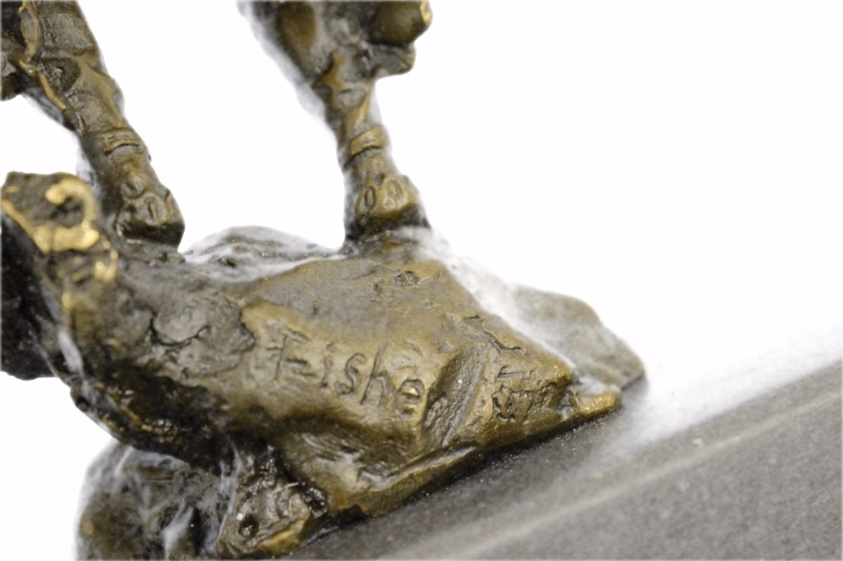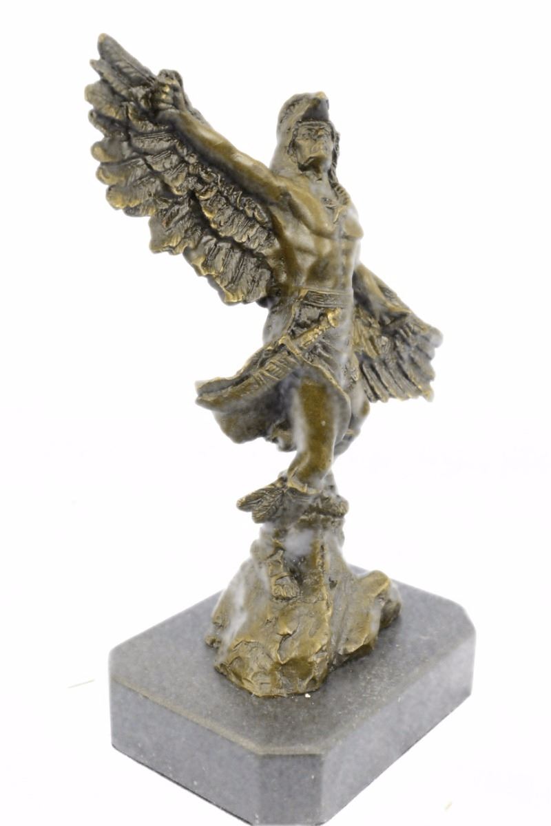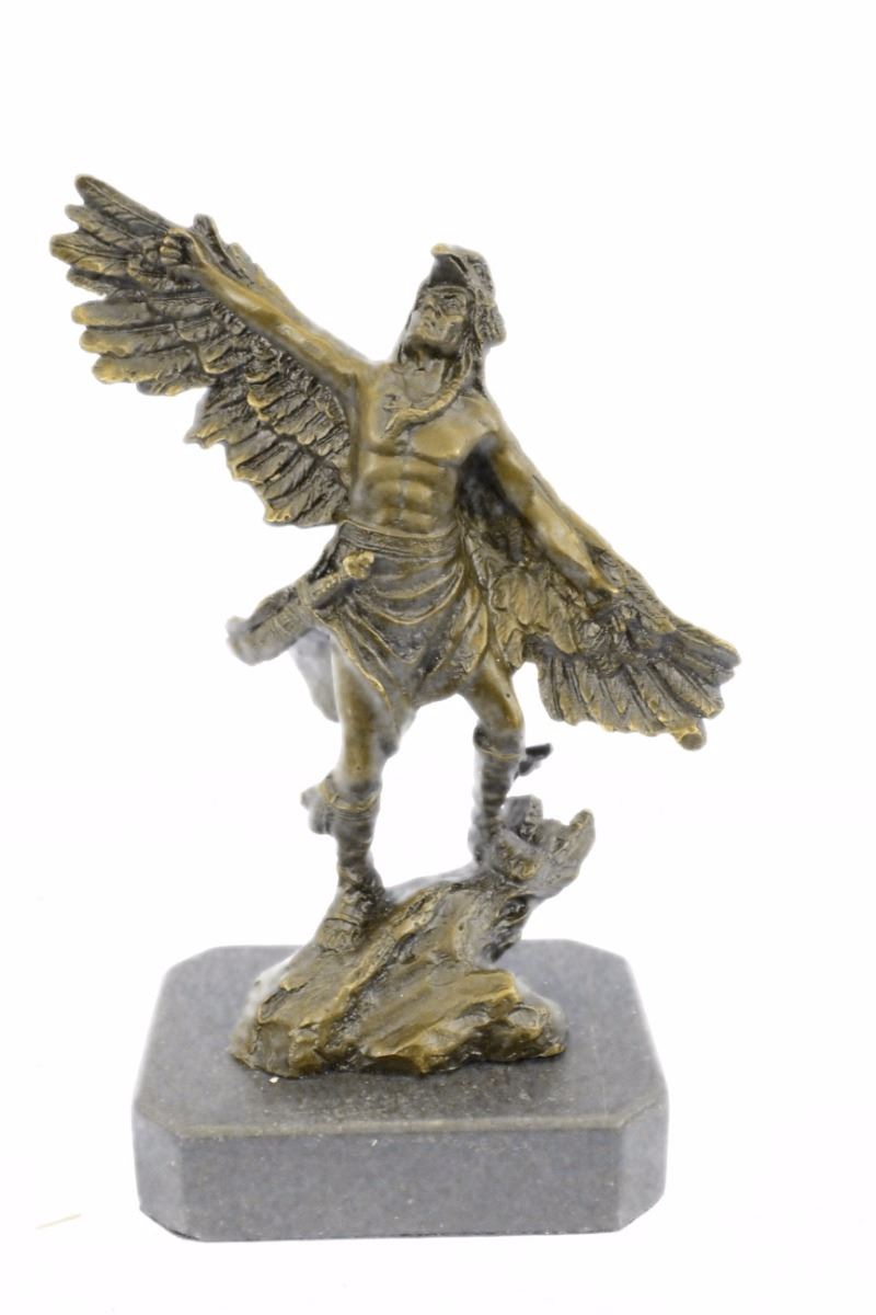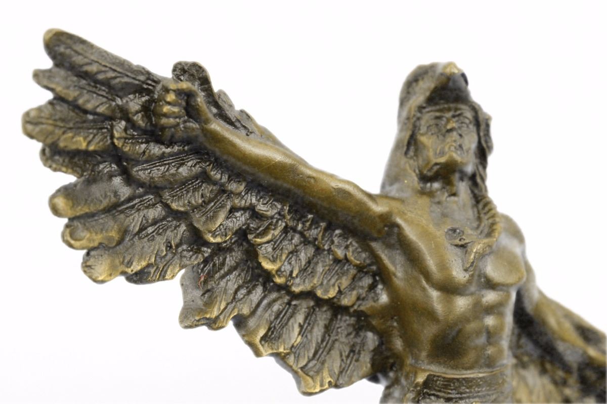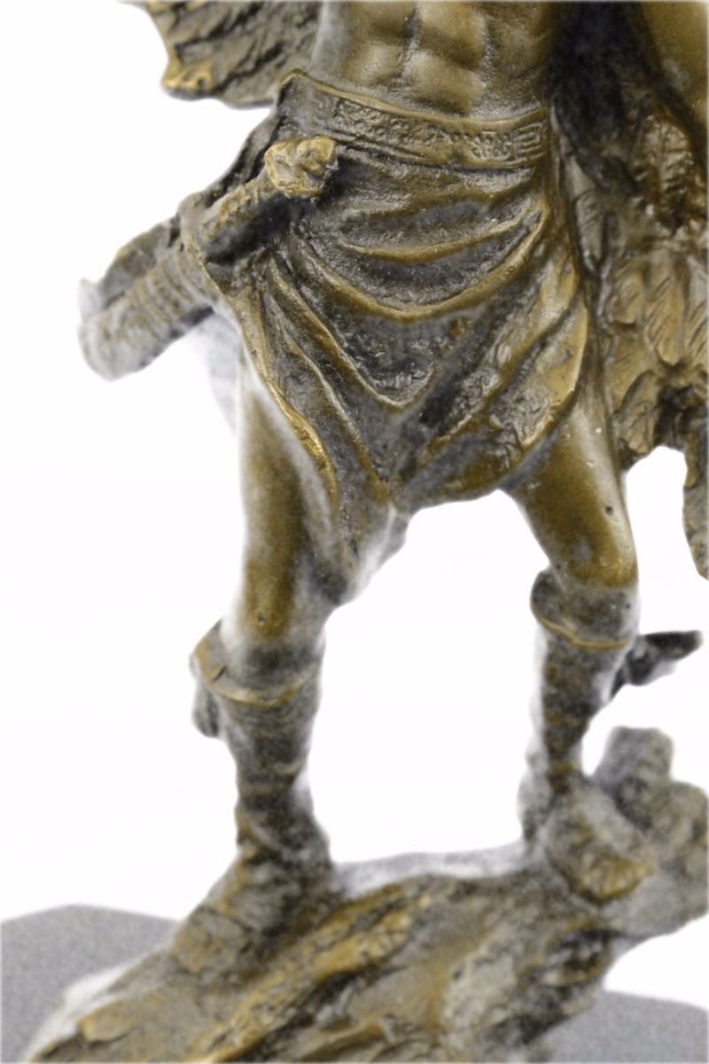 Eagle Dancer Celebrate The Native American Culture With A Native American Statue Inspired By Indian Tribes Of The Past With This Piece That Depicts A Native American Man Wearing Eagle Fur On His Back. He Raises His Hands Out To His Sides, Mimicking The Soaring Of An Eagle And He Looks Up To The Sky In Reverence Of The Majestic Creature. The Detail Of This Skilled Artisan Shows A Wide Array Of Native American Dress As This Man Wears A Belted Loin Cloth, Legging Boots, A Large Hunting Knife, And The Top Of The Eagle Covers The Man's Head Just Enough To Observe The Twisting Of His Braided Hair. This Kind Of Detail Is Not Easy To Master. This Piece Was Undoubtedly Produced By A Highly Skilled Artisan. The Stern Lines In The Man's Face Let You Know That He Has Not Only Been Through A Lot In His Lifetime, But That He Is Also Very Serious About His Mission. Eagle Dances, Ceremonies And Societies Occur Throughout North American Indian Legends And Culture. Golden Eagles, The War Eagle, Were Kept For Their Molted Feathers By Pueblo Indians Of The Southwestern United States. Many Tribes Used Eagle Feathers On Weapons And Head-Dresses To Symbolize Victories And Courage Or To Represent Status. Parts Of Eagles, Including Feathers, Talons, And Skulls, Remain Important In The Ceremonial And Religious Practices Of Many Native American Tribes. From Wing Bones, Plain's Men Fashioned The Whistles They Blew During The Sun Dance, And They Considered Eagle And Bear Claws To Be Powerful Charms. In General, Eagles And Bears Symbolized Nature's Power, Mystery, And Majesty. Indians Worshiped Or Revered Them Across The Continent. As An Addition To Your Or Office, This Piece Would Offer A Glimpse Into Authentic Native American Life. Bronze Dimensions With Marble Base: Height 10 X Width 8 inches. Weight: 7 Lbs.
