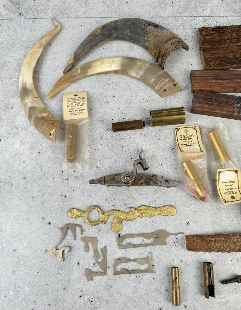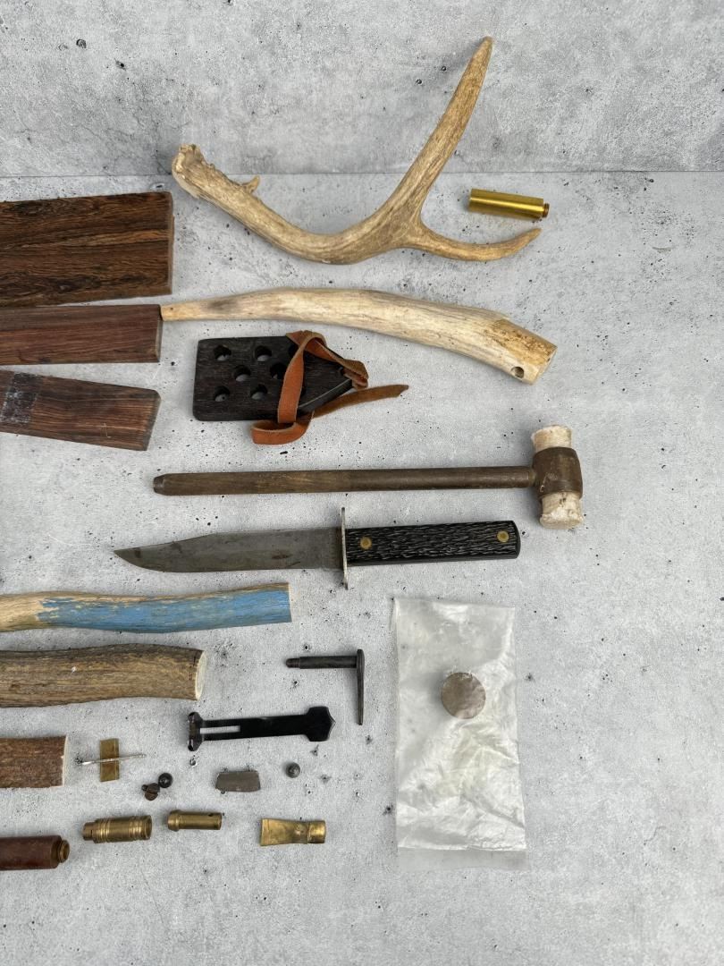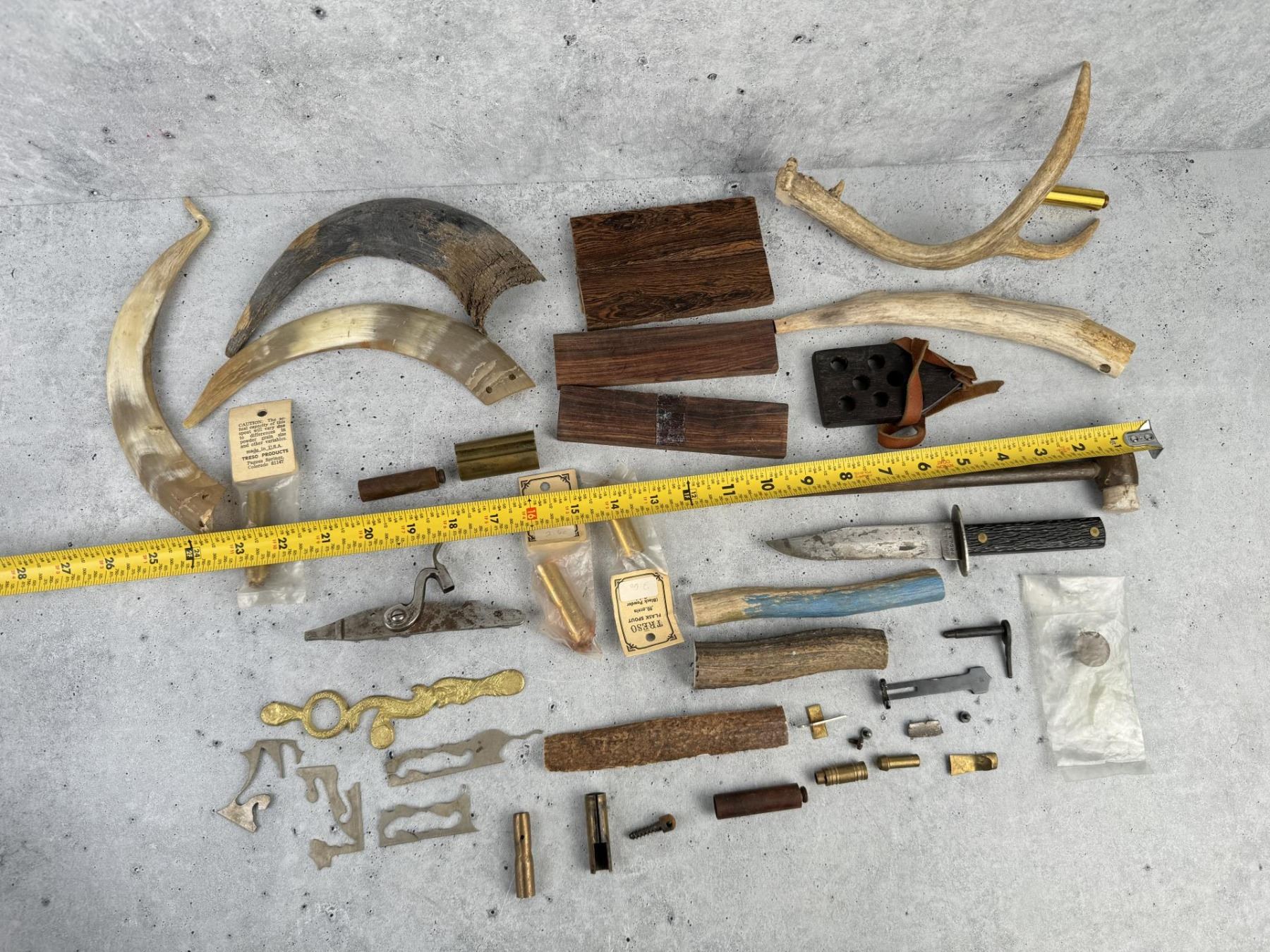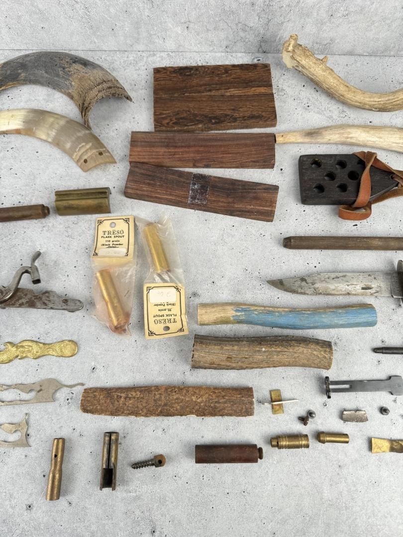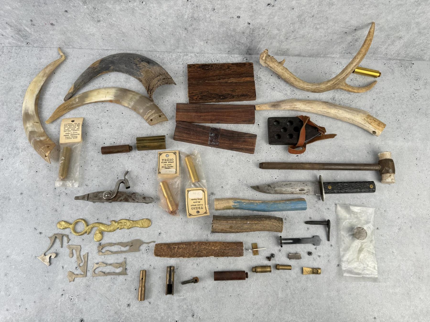 Horns, antlers, gun parts, a knife and etc.