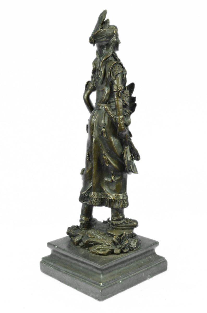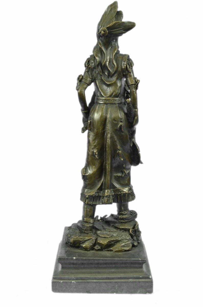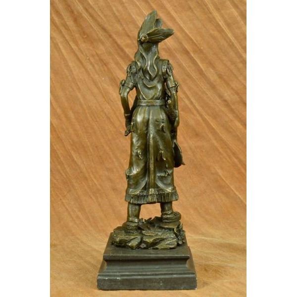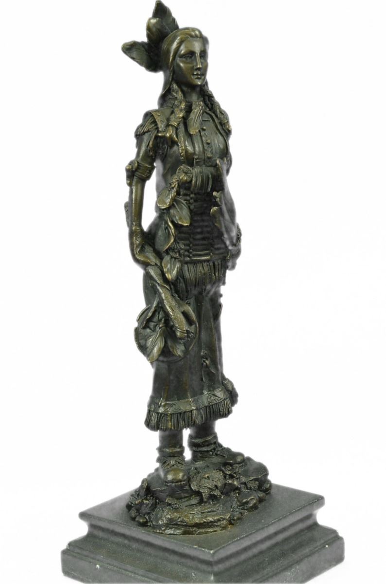 A fierce Native American women prepares to hunt. She stands tall with bravery, silent confidence and stunning beauty on a grassy hill top. Her full eagle-feather and beaded war bonnet covers her head. The feathers round her head, fully extended upright. A beaded choker covers most of her neck. A gun belt is slung over her hips, with a pistol in the holster and extra bullets lining her waistline. Long cloth hangs between her thighs in the front and back, leaving the length and curve of her legs exposed. A beaded vest covers the front of her chest but leaves her sides and back bare, showing off her slender frame. She holds a long rifle to her side with her free hand tucked behind her, resting on her rear. Her thick, wavy mane hangs loosely from the back of her war bonnet, down her back. She wears boots that raise to her calves and tie around the front with a rope. This is a woman that stands behind no man but beside them. Her accessories are in a green patina and her skin and boots are in a brown patina. 100% bronze and handmade, this sculpture was cast using the œLost Wax Method and is mounted on a round black marble base. Bronze Dimensions with Marble Base: Height 15 X Width 5 inches. Weight: 10 LBS. Please Note: This is a reproduction bronze sculpture from the original molded and signed. This featured bronze sculpture is a recast after the original, and has been done recently. This 100% bronze sculpture is an abstract piece certain to be a conversation piece.Please Note: This is a reproduction bronze sculpture from the original molded and signed. This featured bronze sculpture is a recast after the original, and has been done recently. This 100% bronze sculpture is an abstract piece certain to be a conversation piece.