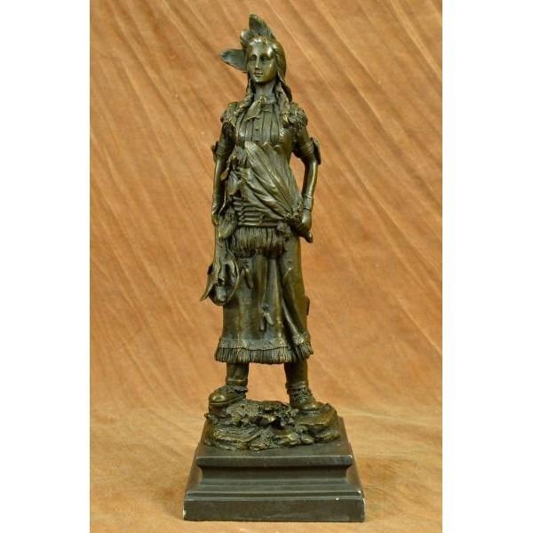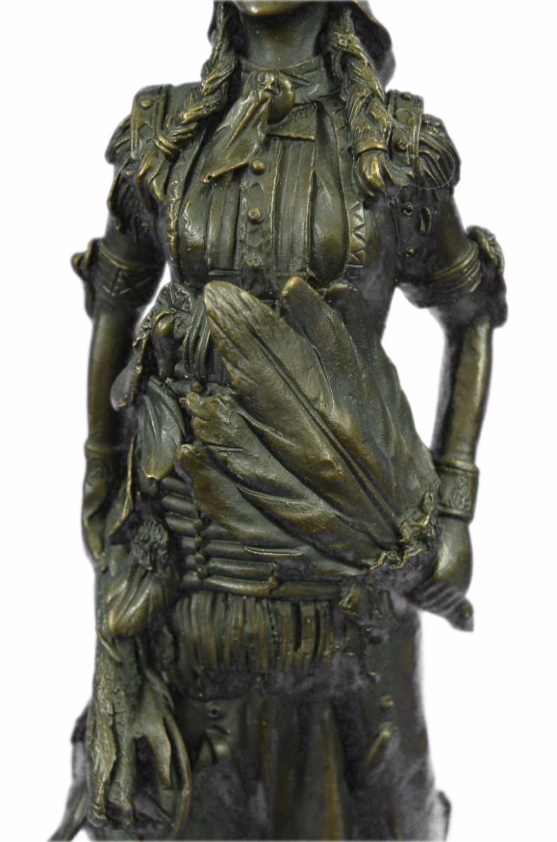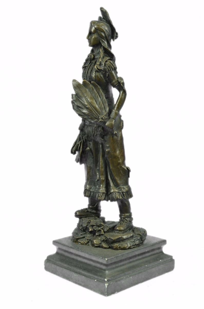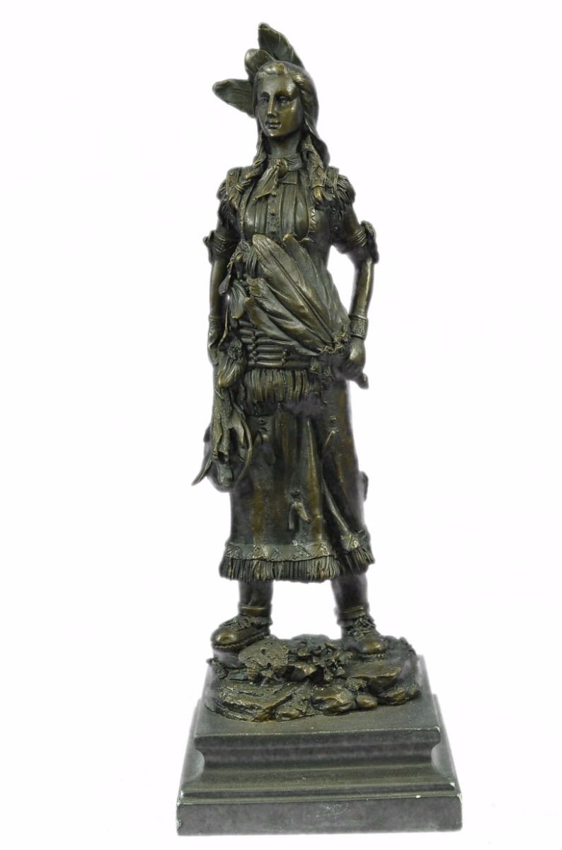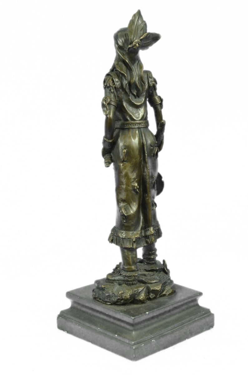 A fierce Native American women prepares to hunt. She stands tall with bravery, silent confidence and stunning beauty on a grassy hill top. Her full eagle-feather and beaded war bonnet covers her head. The feathers round her head, fully extended upright. A beaded choker covers most of her neck. A gun belt is slung over her hips, with a pistol in the holster and extra bullets lining her waistline. Long cloth hangs between her thighs in the front and back, leaving the length and curve of her legs exposed. A beaded vest covers the front of her chest but leaves her sides and back bare, showing off her slender frame. She holds a long rifle to her side with her free hand tucked behind her, resting on her rear. Her thick, wavy mane hangs loosely from the back of her war bonnet, down her back. She wears boots that raise to her calves and tie around the front with a rope. This is a woman that stands behind no man but beside them. Her accessories are in a green patina and her skin and boots are in a brown patina. 100% bronze and handmade, this sculpture was cast using the œLost Wax Method and is mounted on a round black marble base. Bronze Dimensions with Marble Base: Height 15 X Width 5 inches. Weight: 10 LBS. Please Note: This is a reproduction bronze sculpture from the original molded and signed. This featured bronze sculpture is a recast after the original, and has been done recently. This 100% bronze sculpture is an abstract piece certain to be a conversation piece.Please Note: This is a reproduction bronze sculpture from the original molded and signed. This featured bronze sculpture is a recast after the original, and has been done recently. This 100% bronze sculpture is an abstract piece certain to be a conversation piece.