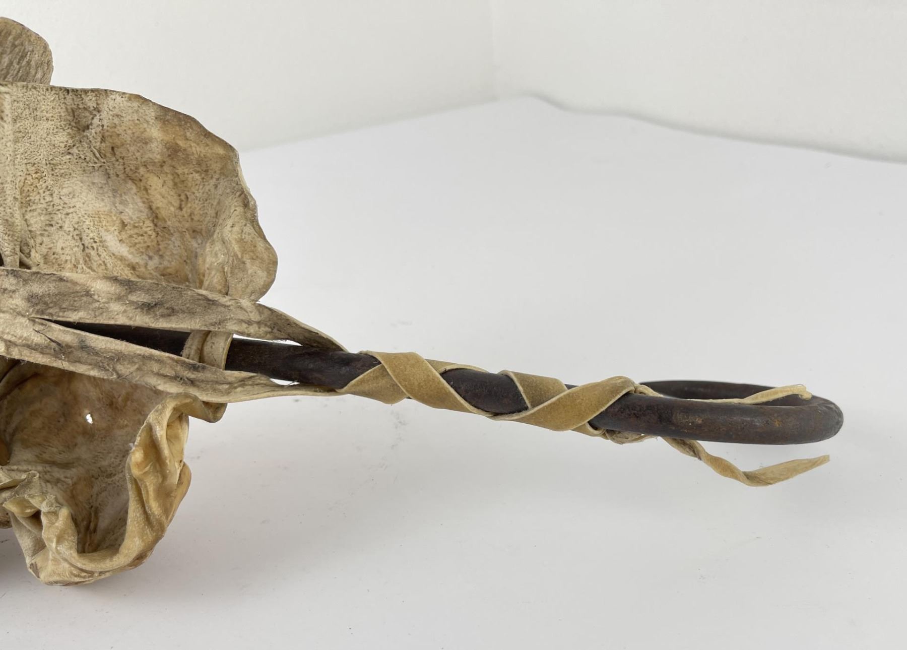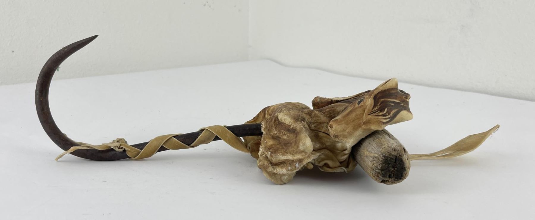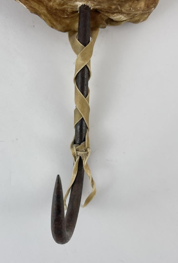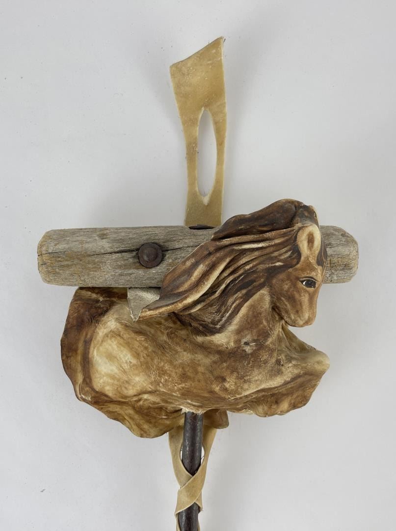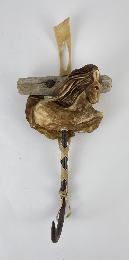 Unusual. Artisan has molded a horse from rawhide and wrapped it around the hay hook. 17" long.