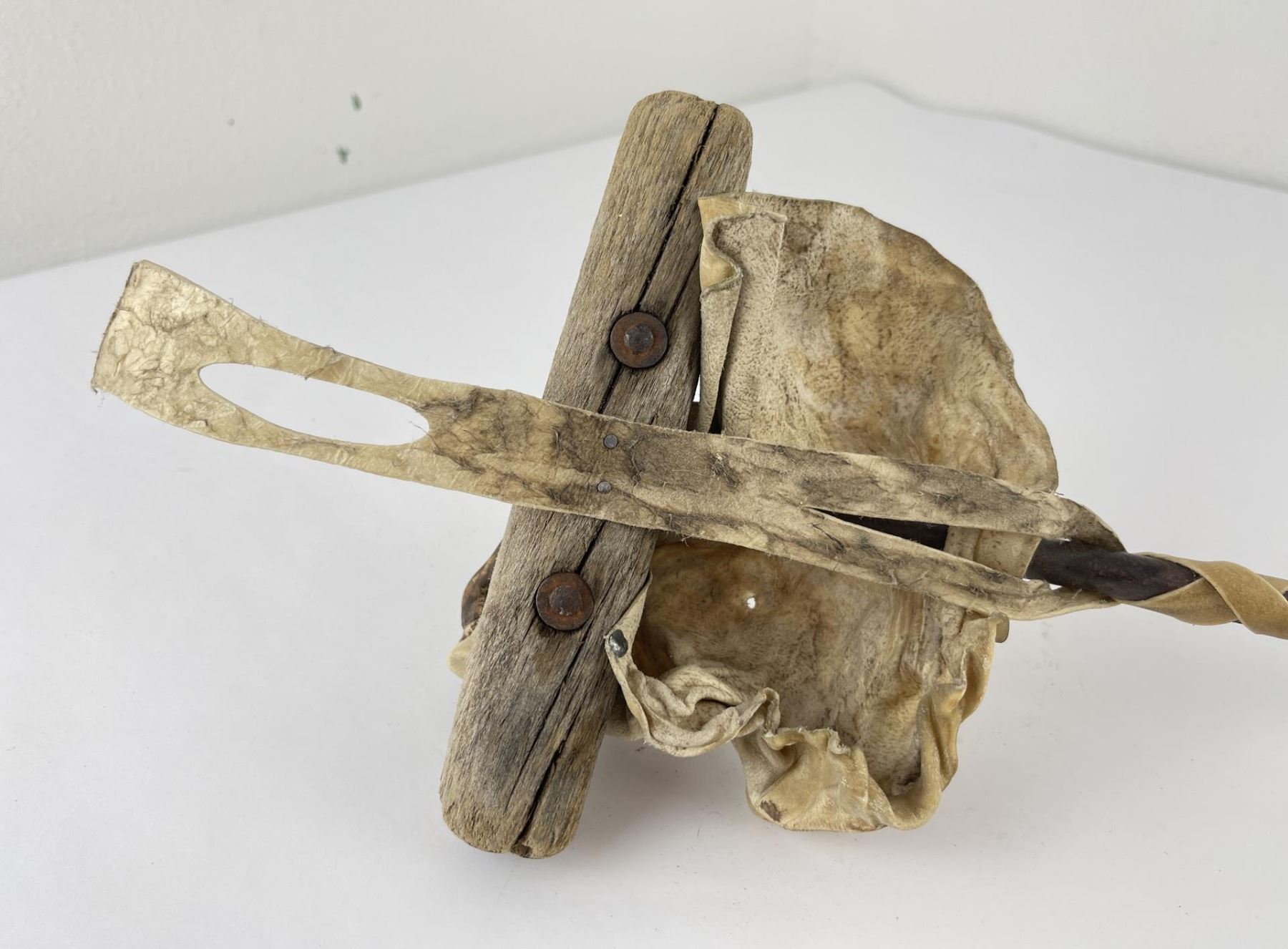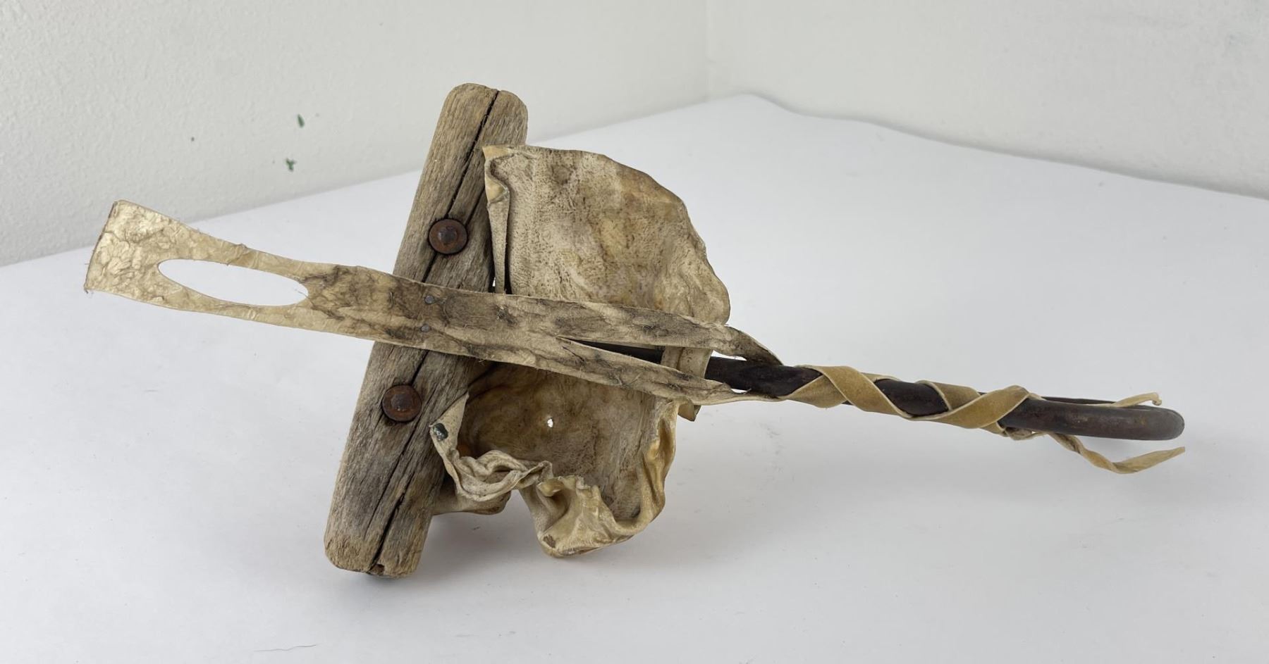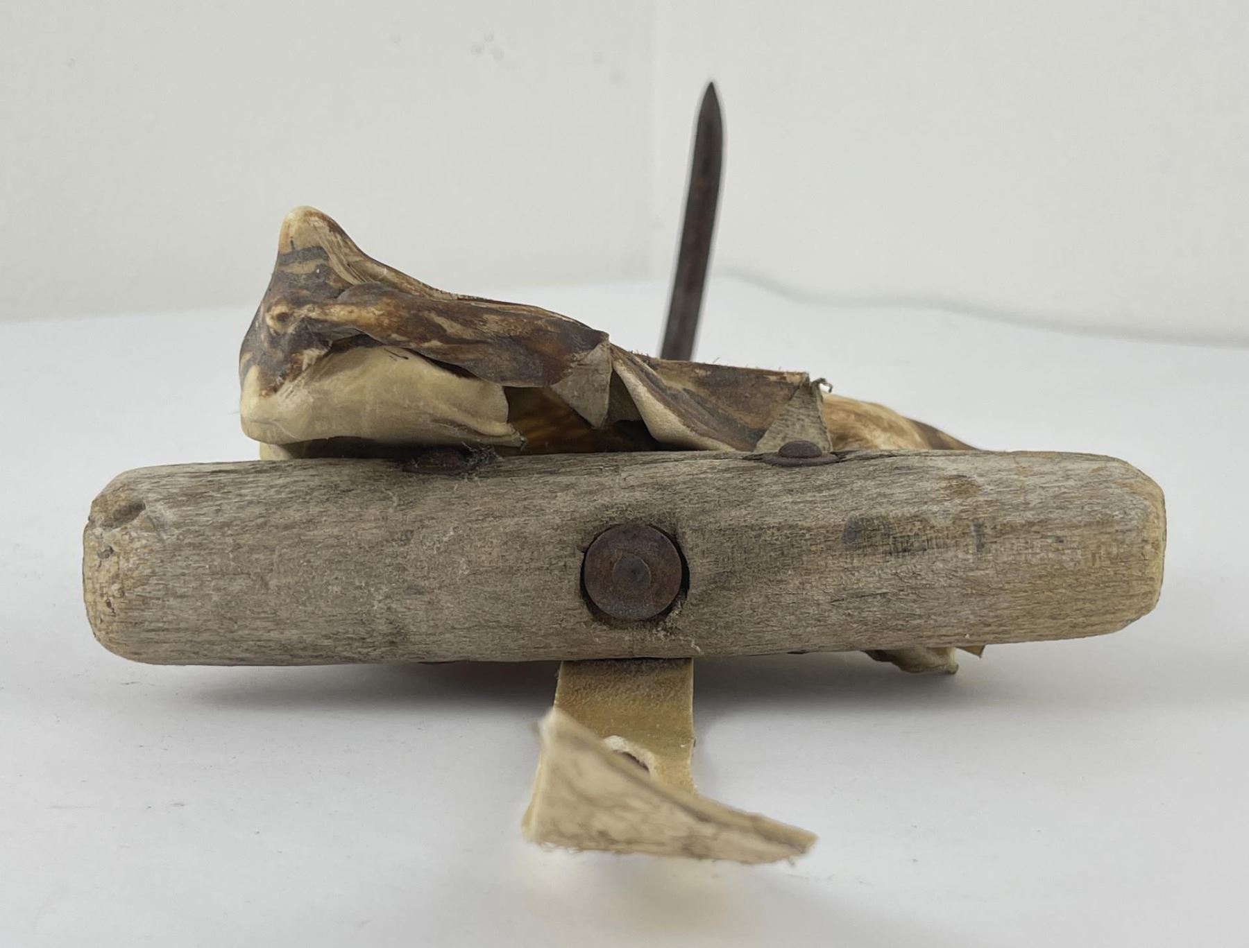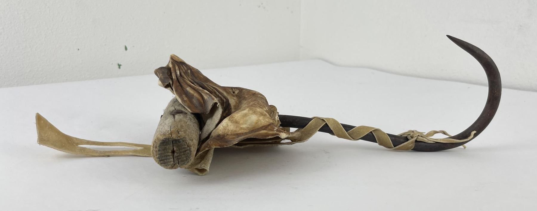 Unusual. Artisan has molded a horse from rawhide and wrapped it around the hay hook. 17" long.