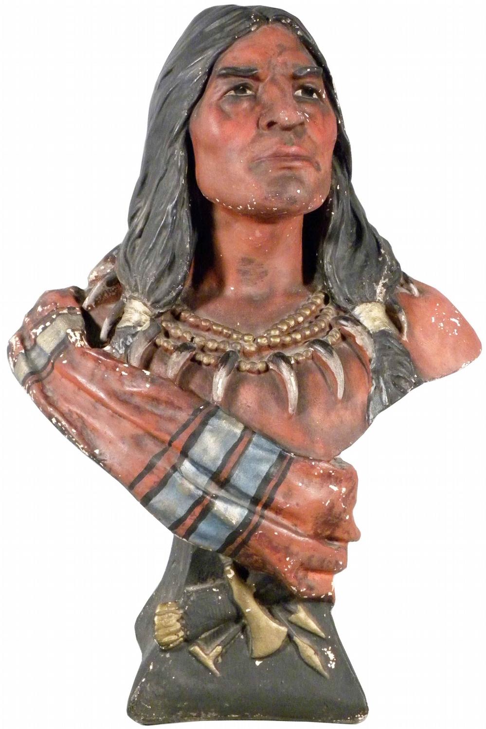 Native American Indian chalk bust with bear claw wrap. A few paint chips otherwise very good condition. 18 inches tall.