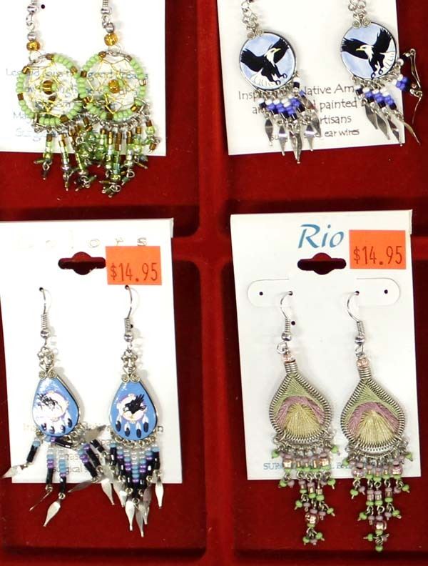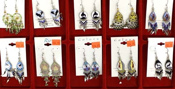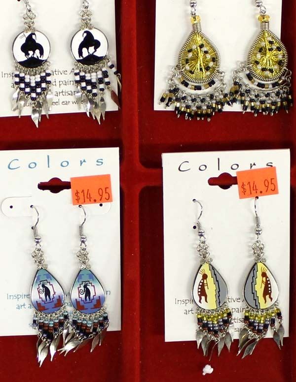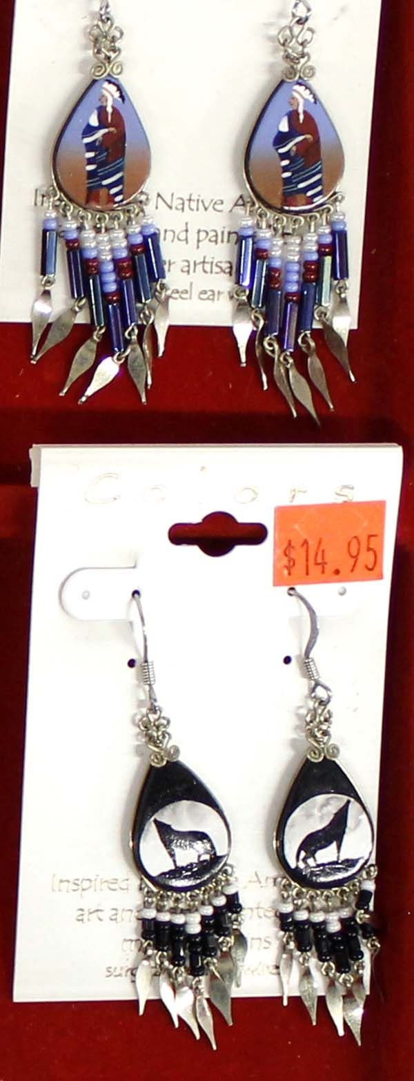 10 Pairs of Native American Inspired Hand Painted Earrings by Colors, surgical steel ear wires, measures .75'' x 2.5''
