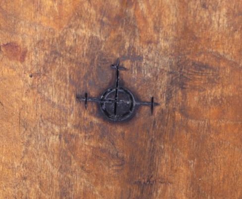 The lot features a Native American Indian hand carved wood mirror board in the likeness of the famous Iowa circa 1880 piece. The board shows a horse head carving with weaping heart cutout and inlaid pewter lead accents. The body of the board shows a diamond shaped opening for the mirror with red outline and iron brass tacks accenting. The Europeans would frequently trade small glass mirrors with the Native Americans, with the Indian ornamenting the frames as such. The reverse of the piece is marked in the inlay, “IOWA 1880” as the makers mark. The age of this piece is unknown, and is most likely a 20th century recreation. Measures 5 7/8”W x 11.75”H x 1”D.