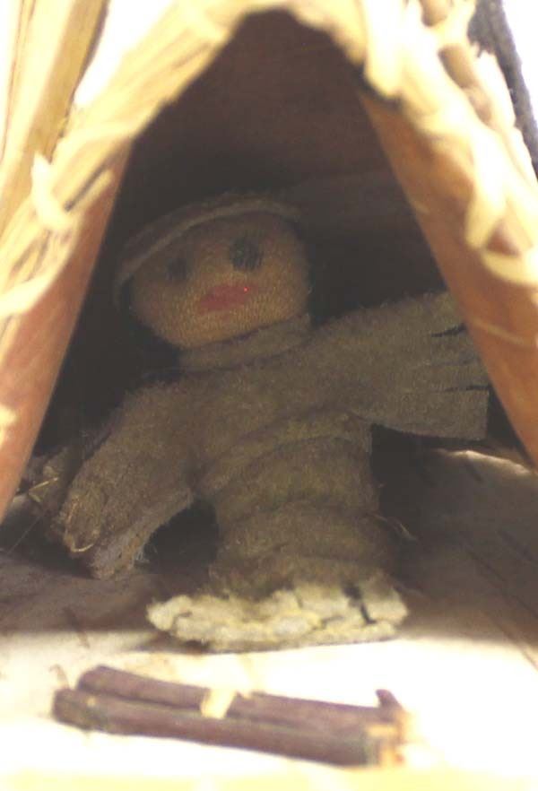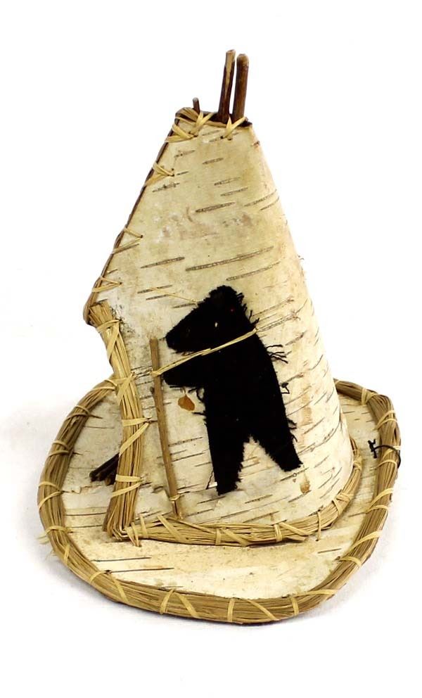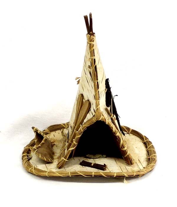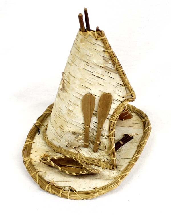 Native American Iroquois Birch Bark Tipi, measures 6.5'' x 8'' x 5'', also includes canoe and oars