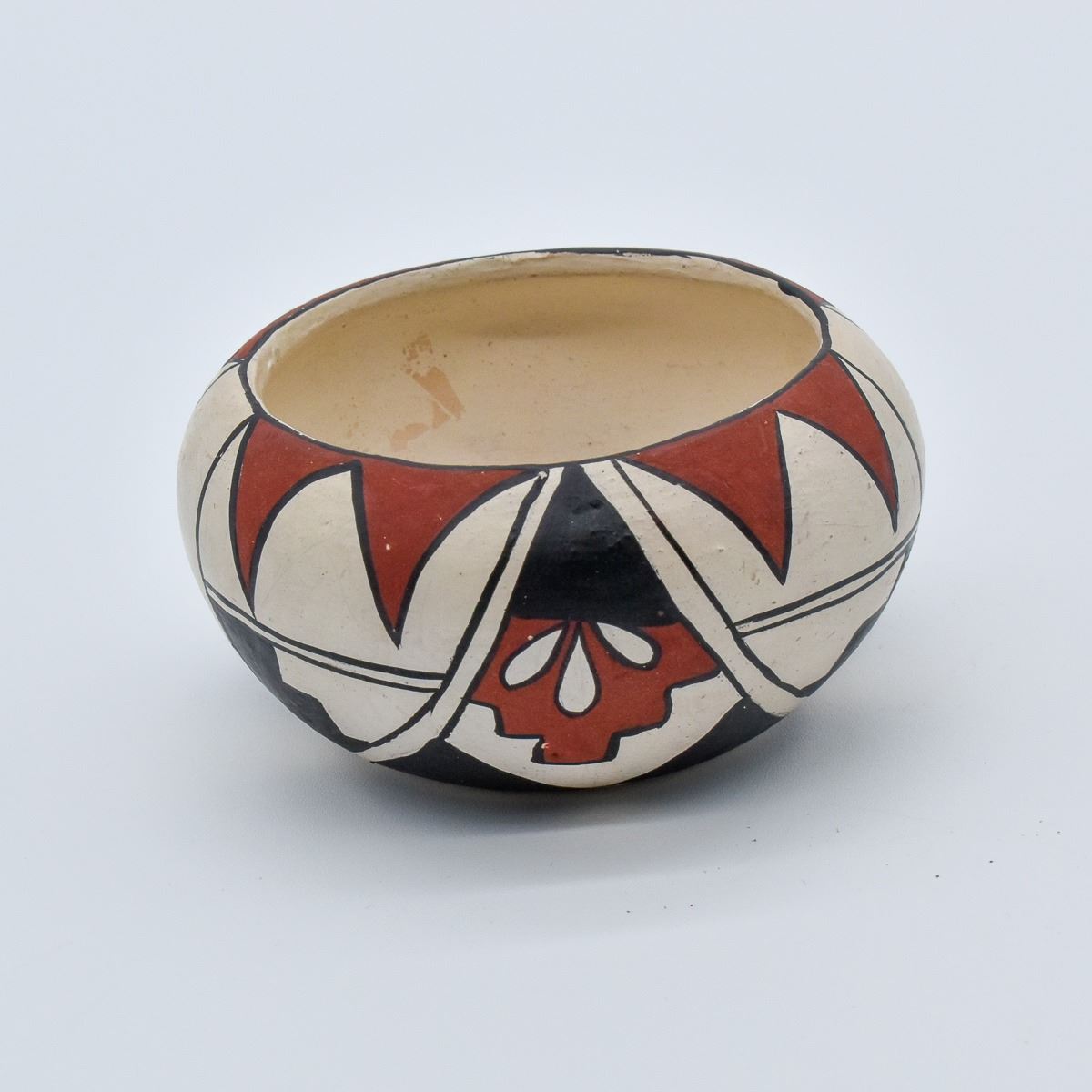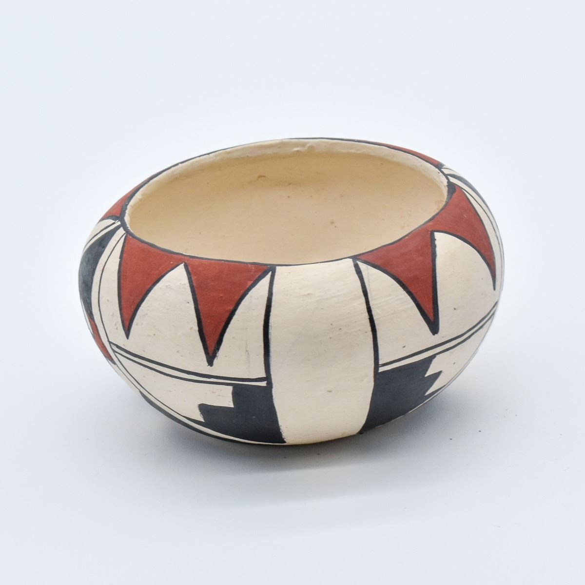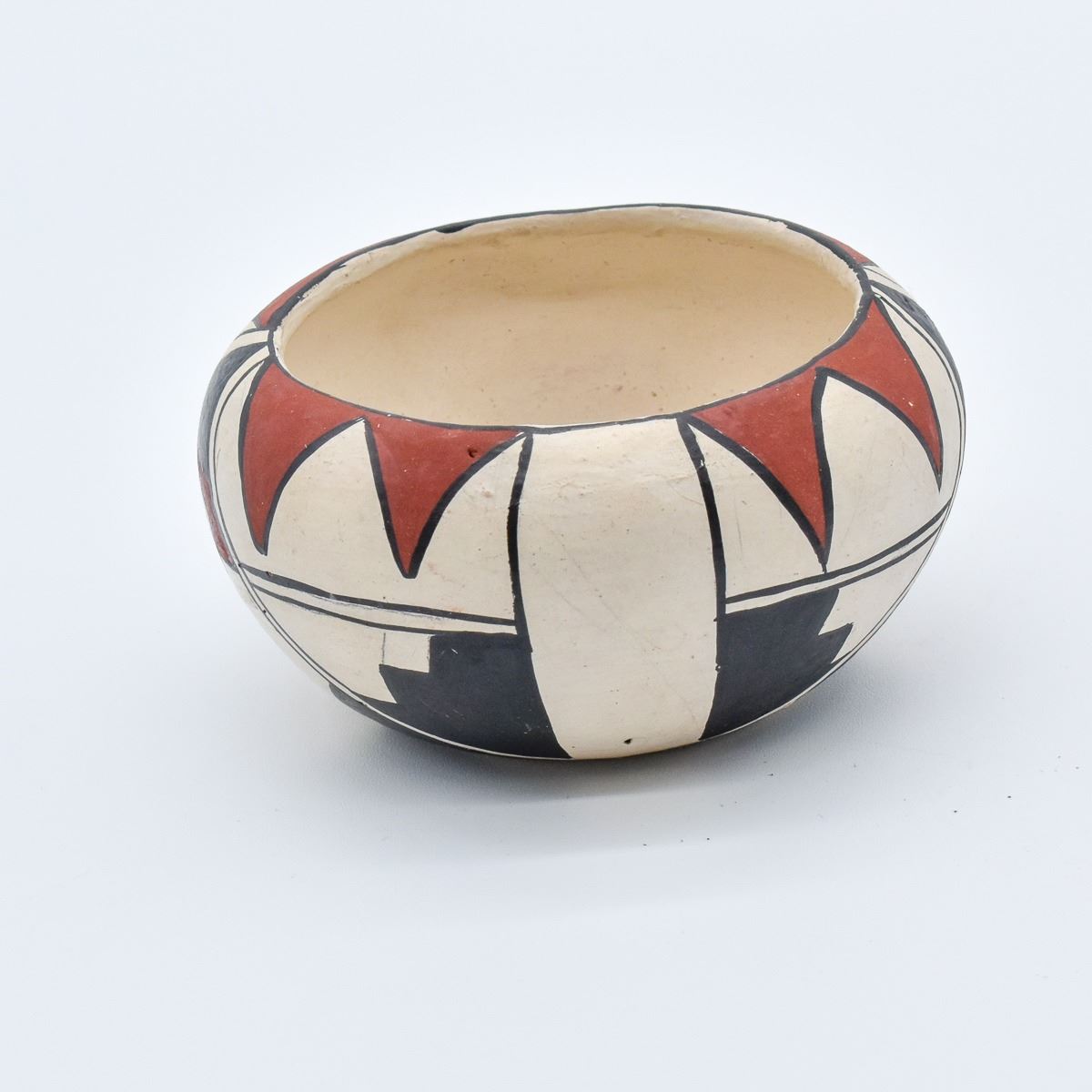 Native American Isleta Pueblo Pottery Bowl. This tri-colored item measures 2'' x 4''