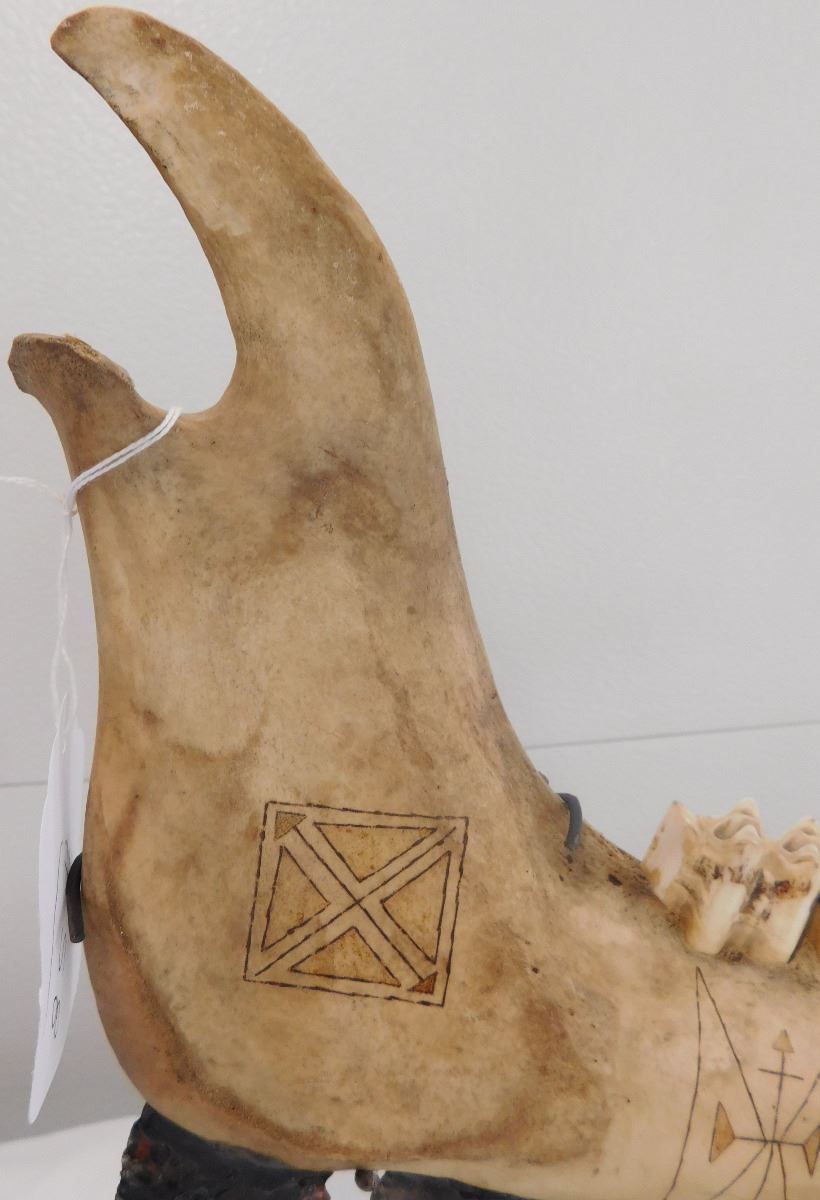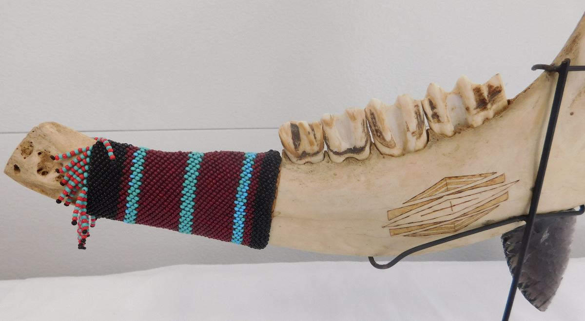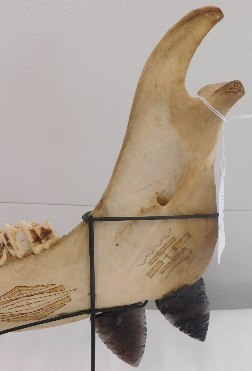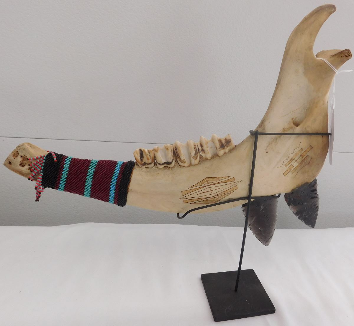 Native American Jawbone Club, 20th century item. Made of jawbone, teeth, glass beads and obsidian, the item measures 15" x 12" x 2". Plains Indian. Custom made stand included as well as 2 fantastic obsidian points set in jawbone. Condition: Very good, on stand, see images. Shipping: $30.00