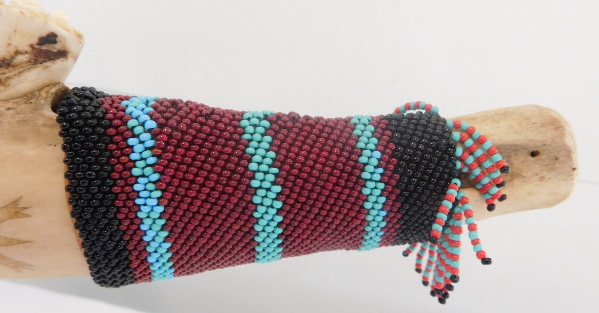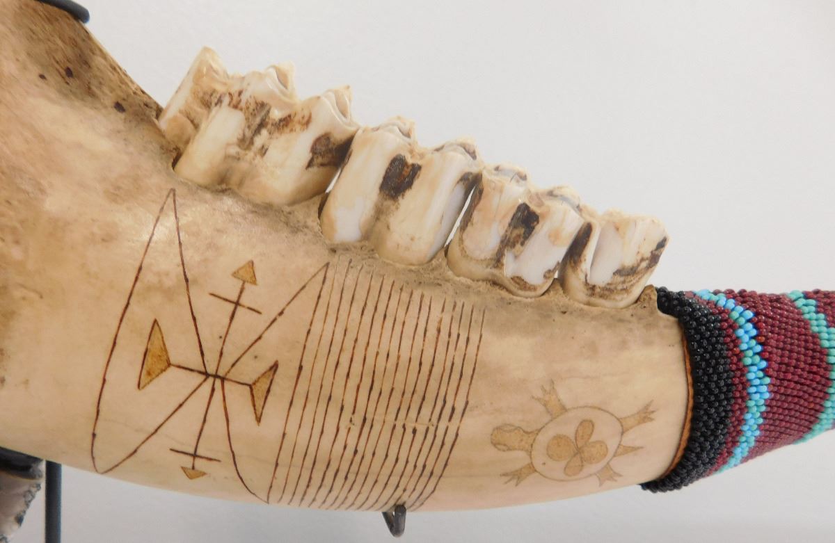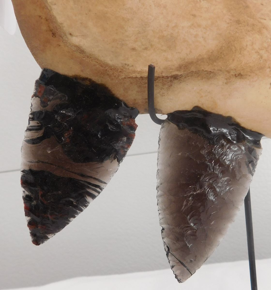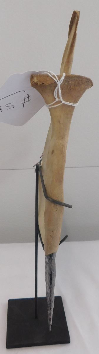 Native American Jawbone Club, 20th century item. Made of jawbone, teeth, glass beads and obsidian, the item measures 15" x 12" x 2". Plains Indian. Custom made stand included as well as 2 fantastic obsidian points set in jawbone. Condition: Very good, on stand, see images. Shipping: $30.00