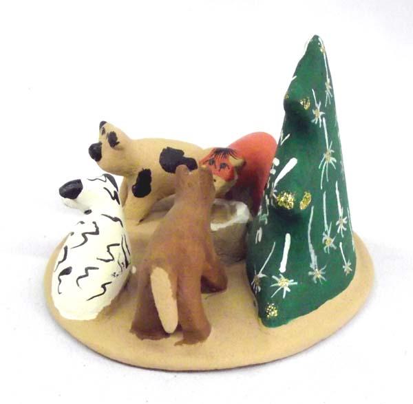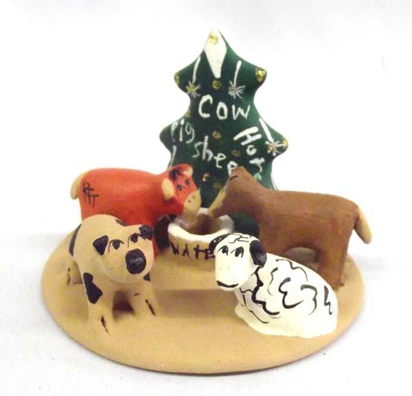 Native American Jemez Folkart Pottery by R T Toya, statue consists of Christmas Tree and on tree the words cow, horse, pig, and sheep, measures approx. 3.75''Base Diameter x 2.75''. Buyers Pay Actual Shipping and Handling Charges(see terms and conditions for more information)
