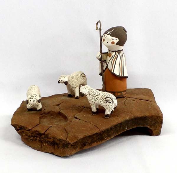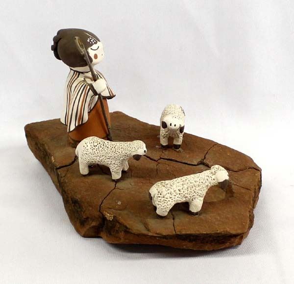 Native American Jemez Pottery Folk Art, depicts young shepherdess with her 3 little lambs mounted on stone base, measures 9'' x 6'' x 6'', wood staff, possible artist's initials on sheep