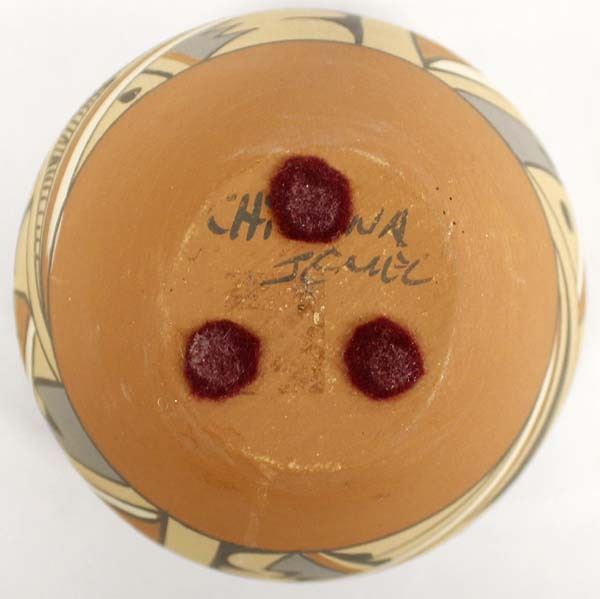 Massey Estate: Native American Jemez Polychrome Pottery Jar by Chinana, measures 4.5''H x 4.5''D and is signed by the artist
