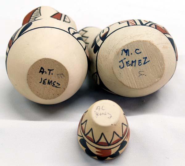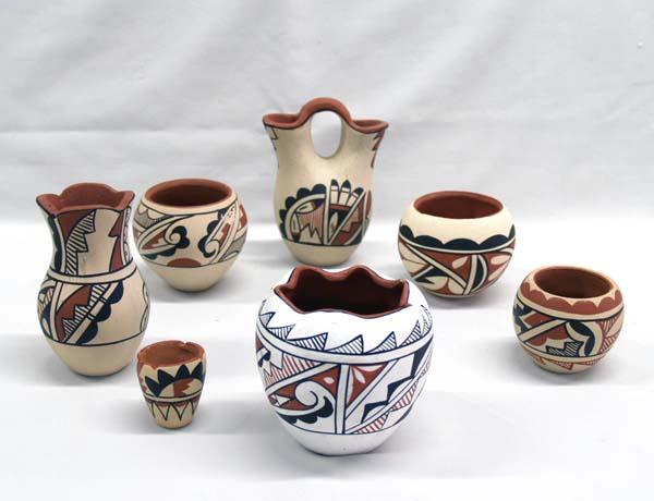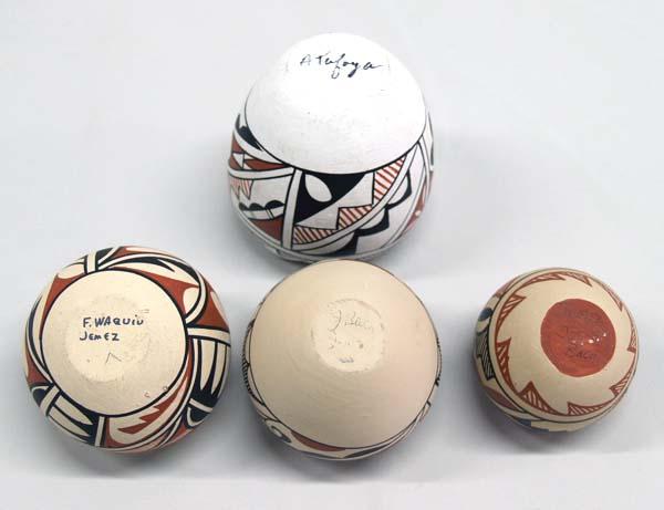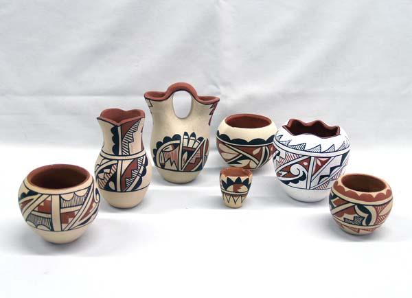 7 Native American Jemez Pots, all are signed on the bottom, artists include: M.C., F. Waquiu, A. Tafoya, A.L., & Josie Baca. Largest measures approx. 3 1/2''H x 3 1/2''W. Some minor chips and shelf ware as seen in pictures. Buyers Pay Actual Shipping and Handling Charges(see terms and conditions for more information).