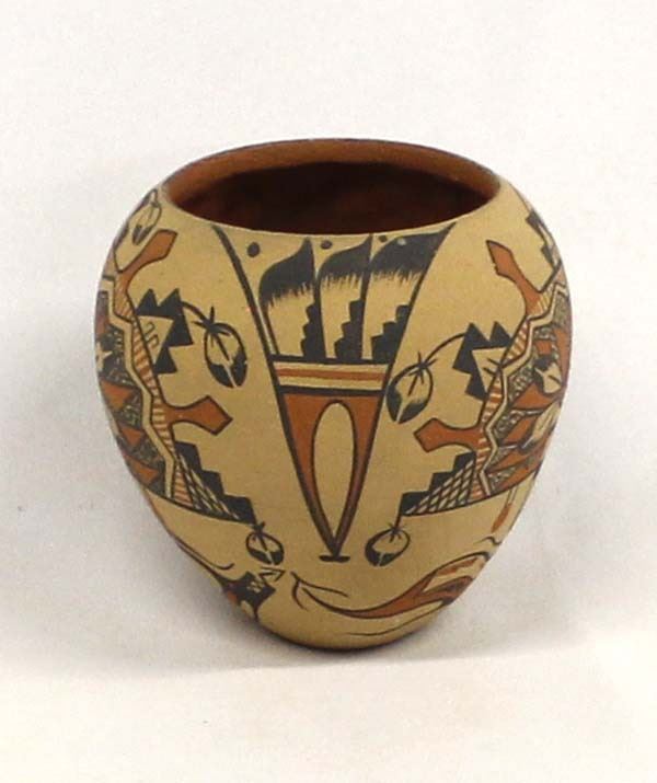 Native American Jemez Pueblo Polychrome Pottery Jar, measures 3.5'' x 3.5'' and is signed on the bottom, beautiful lines, designs, and colors