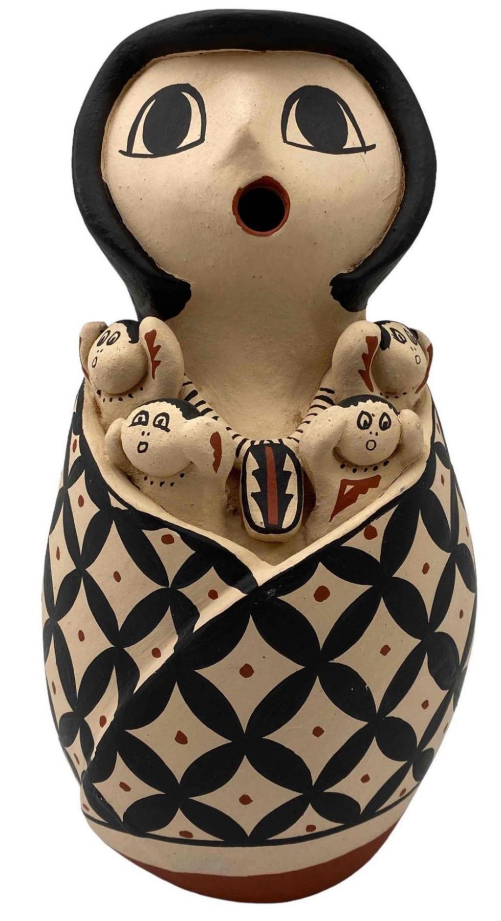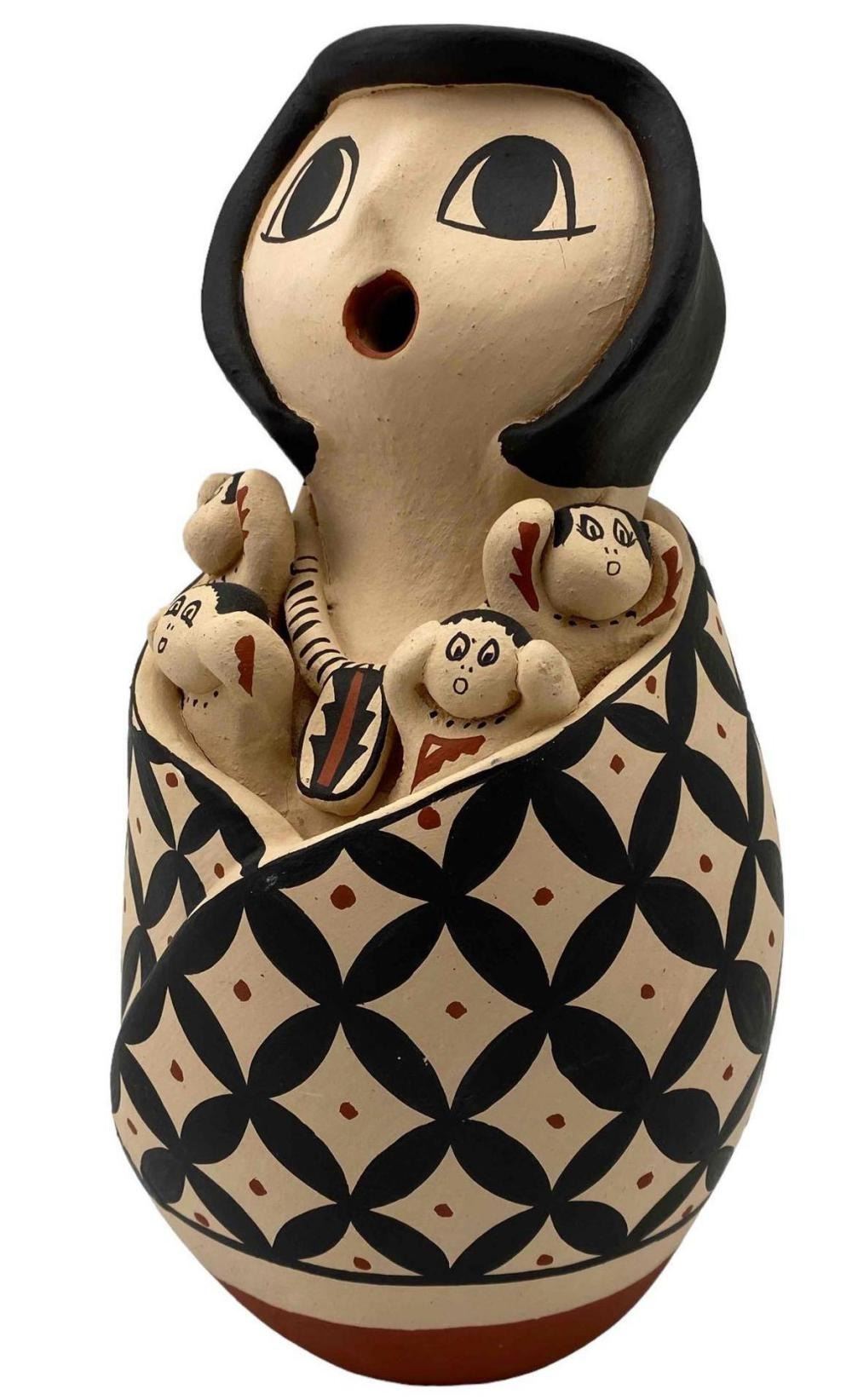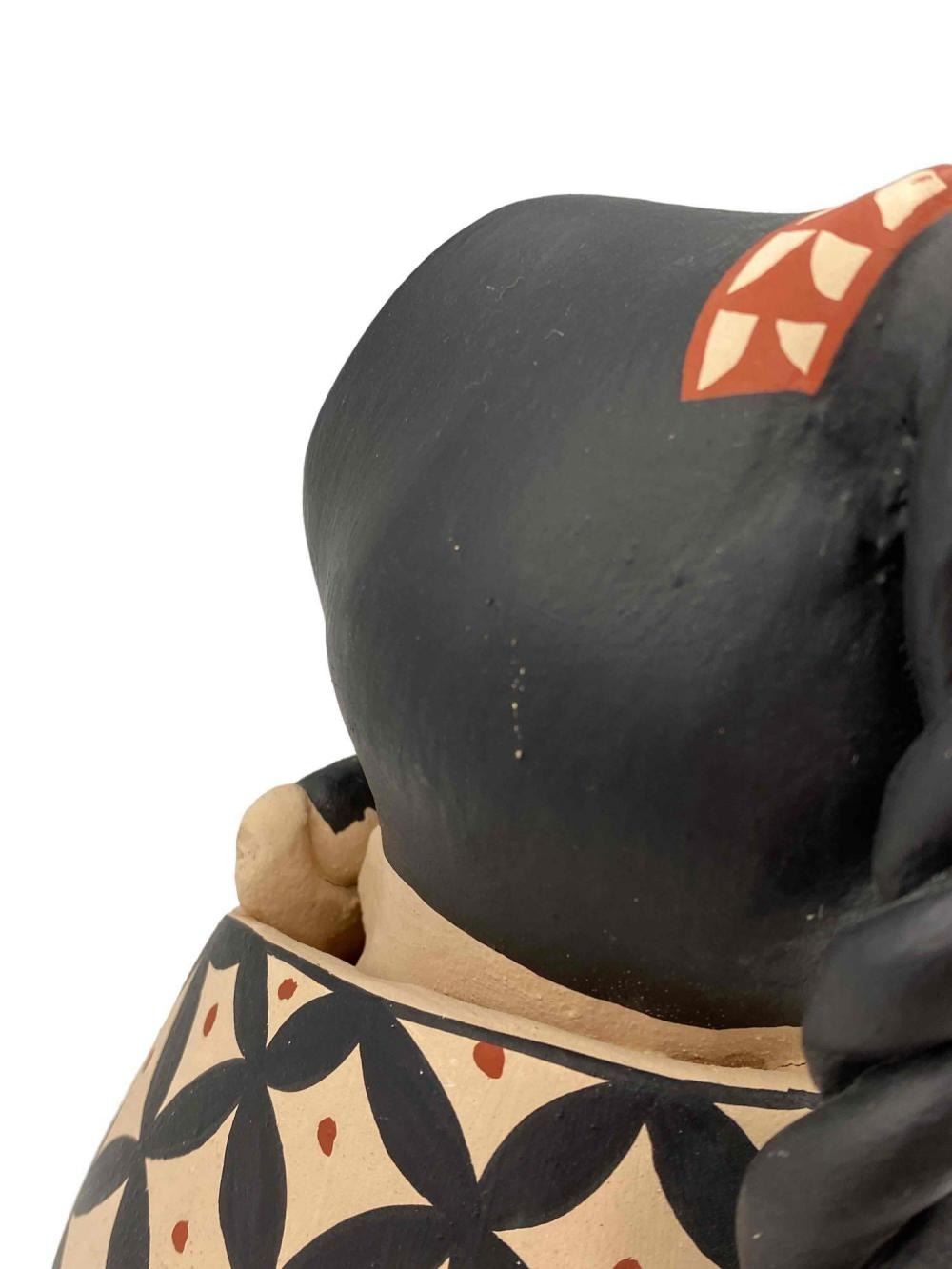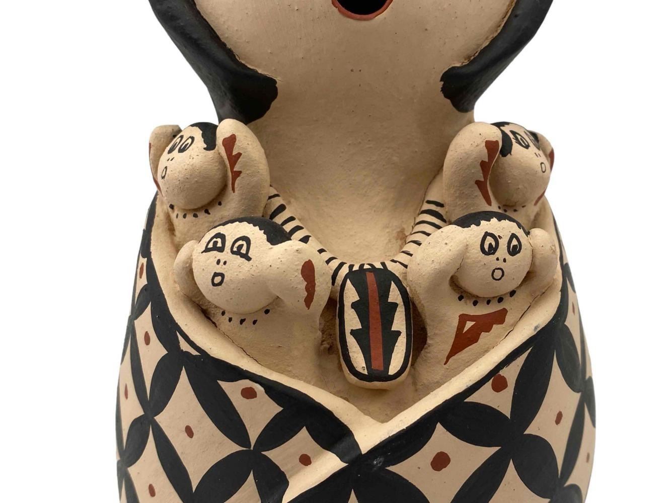 Native American Jemez Pueblo Pottery Storyteller Figure. Marked Jemez. Approximately 8.75H x 4.125W x 4.5D in.