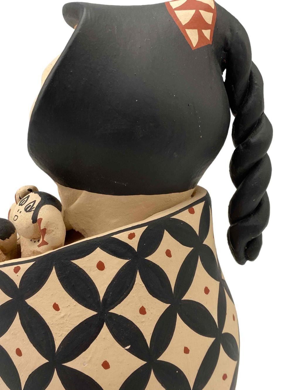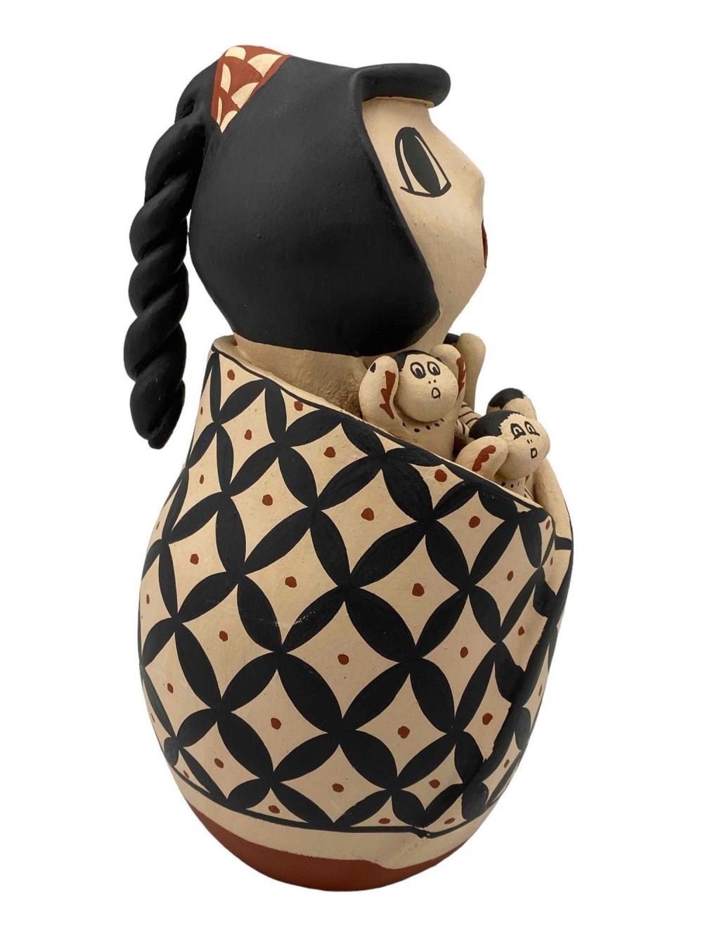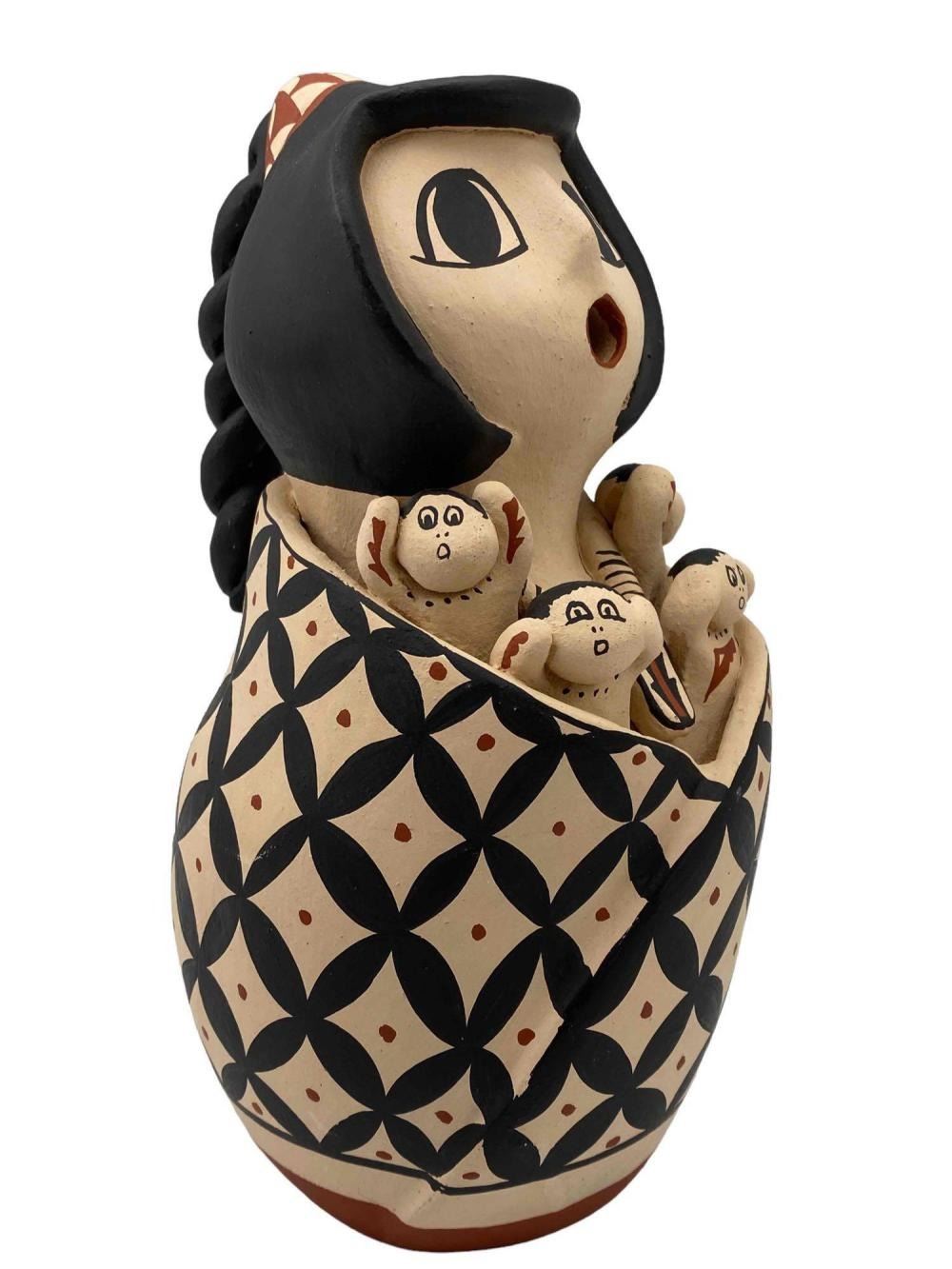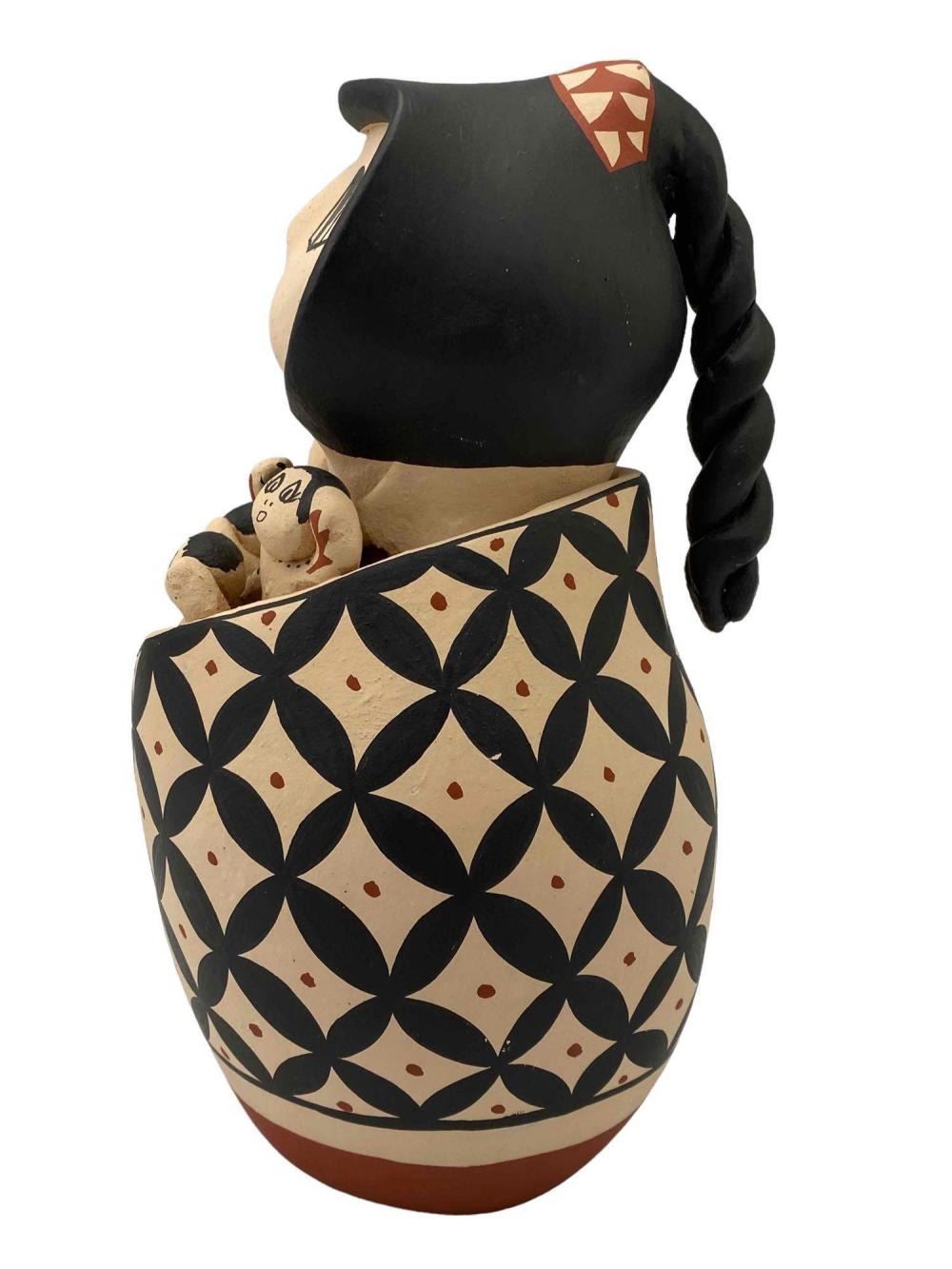 Native American Jemez Pueblo Pottery Storyteller Figure. Marked Jemez. Approximately 8.75H x 4.125W x 4.5D in.