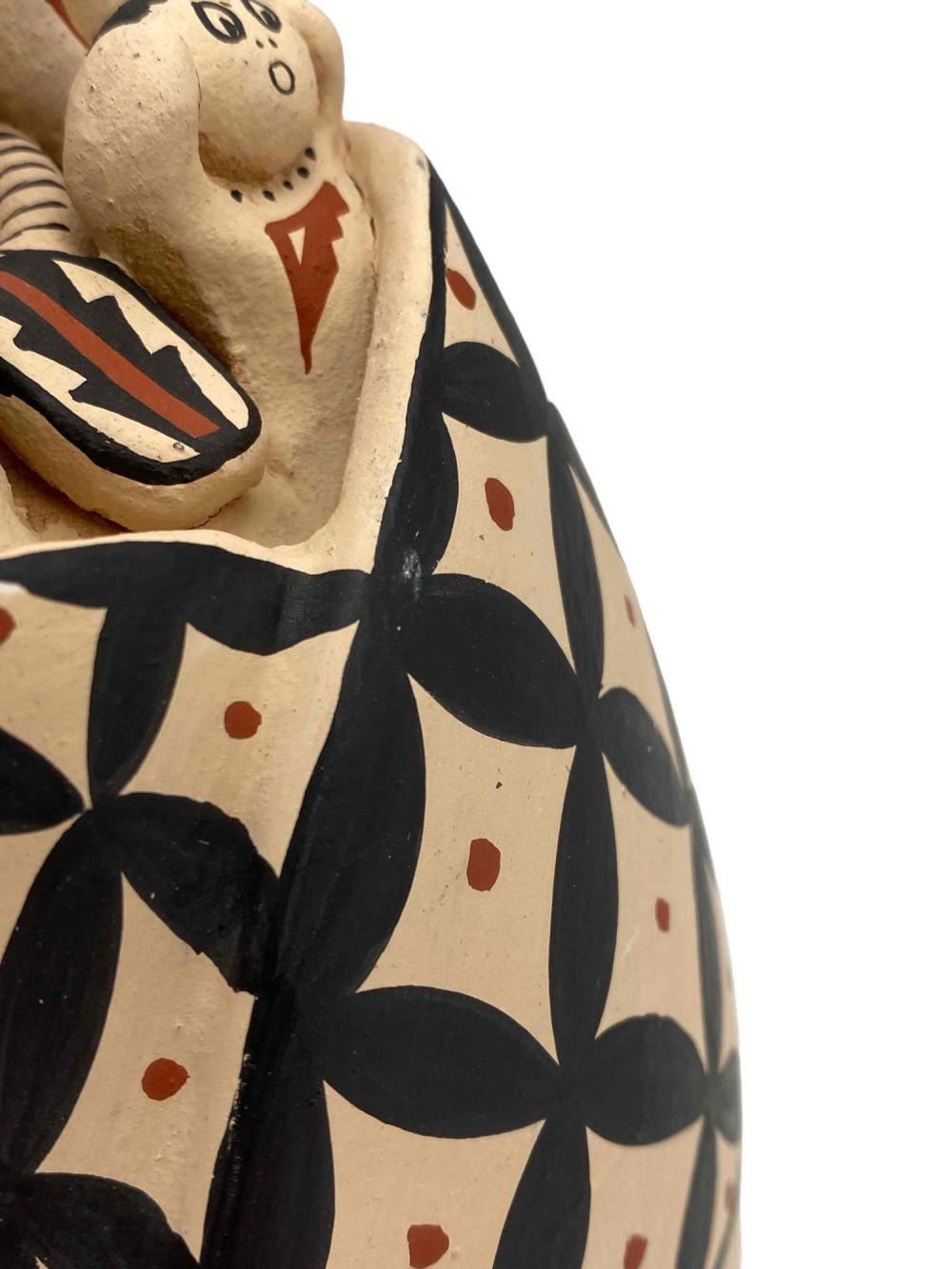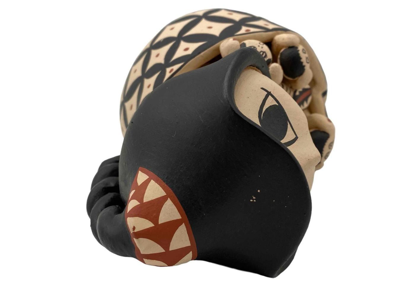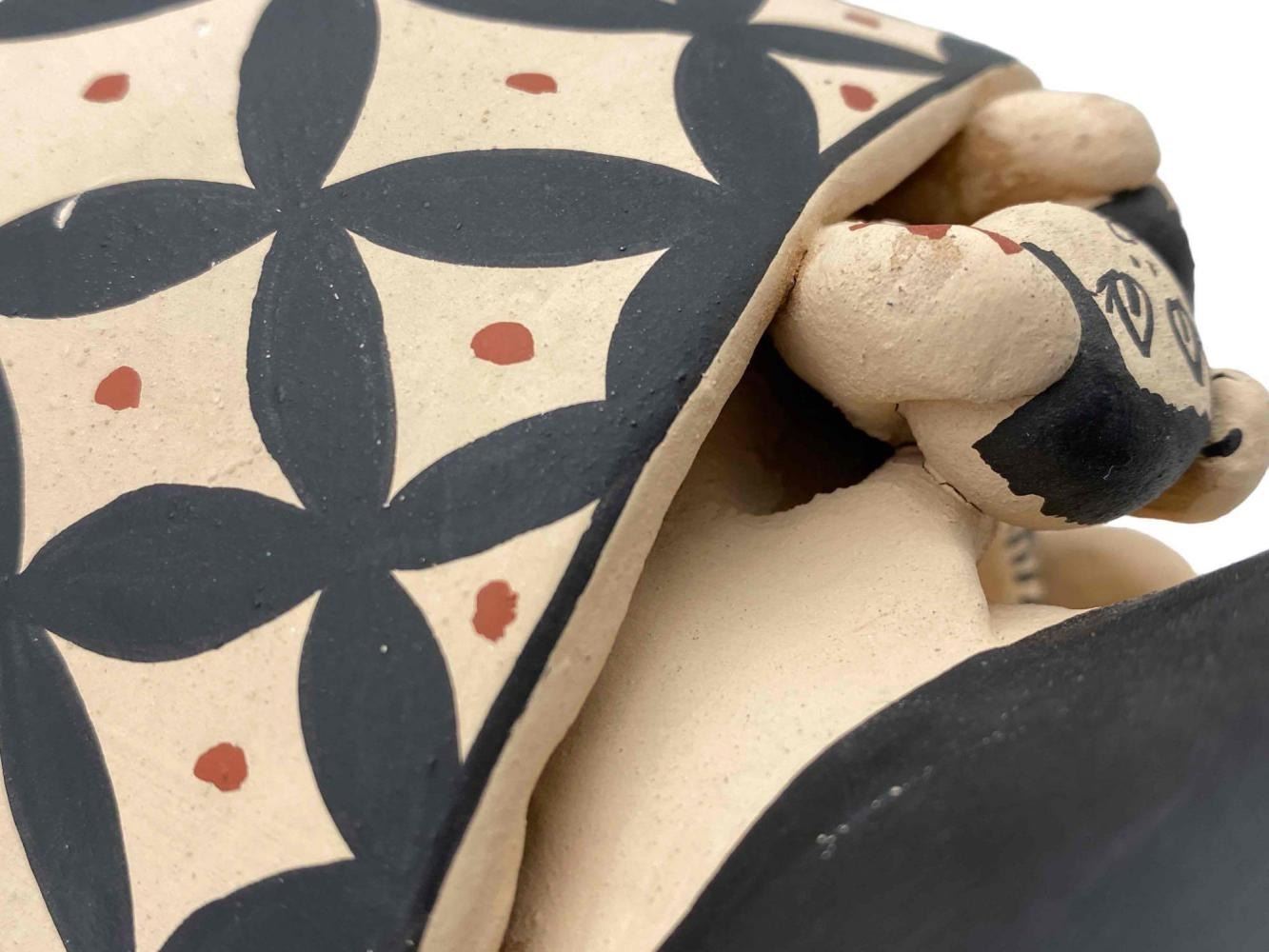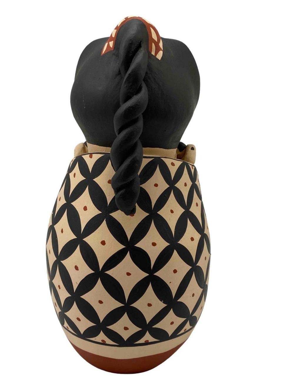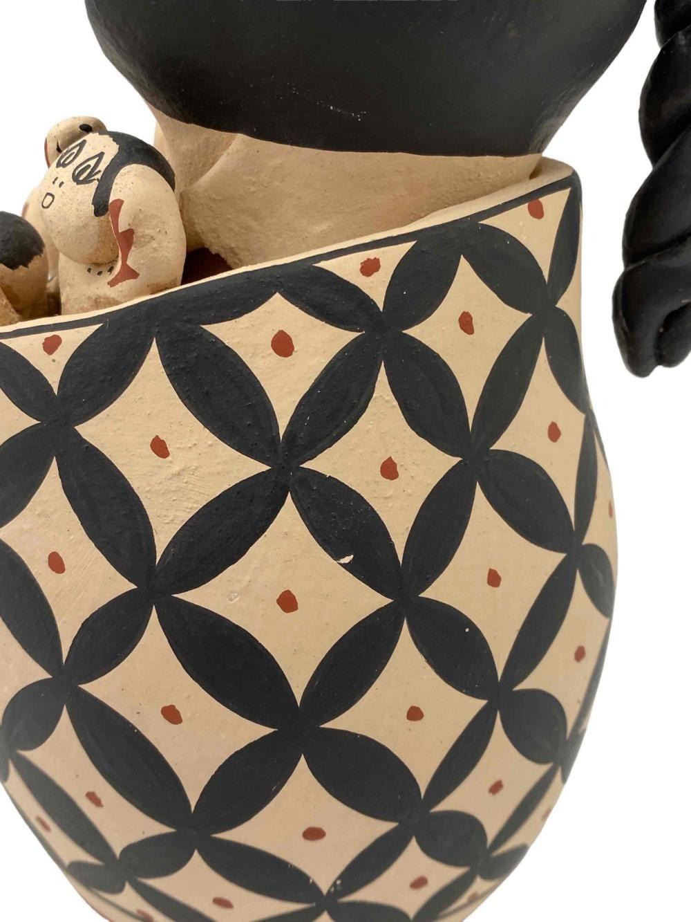 Native American Jemez Pueblo Pottery Storyteller Figure. Marked Jemez. Approximately 8.75H x 4.125W x 4.5D in.
