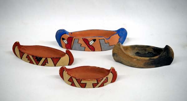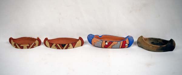 Native American Jemez and Catawba Pottery Canoes, largest is Jemez Poster Paint measuring 6''L, includes 3 Jemez and 1 Catawba, 2 Jemez are signed M.G. Jemez